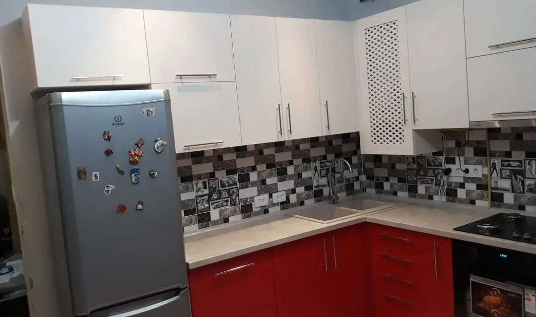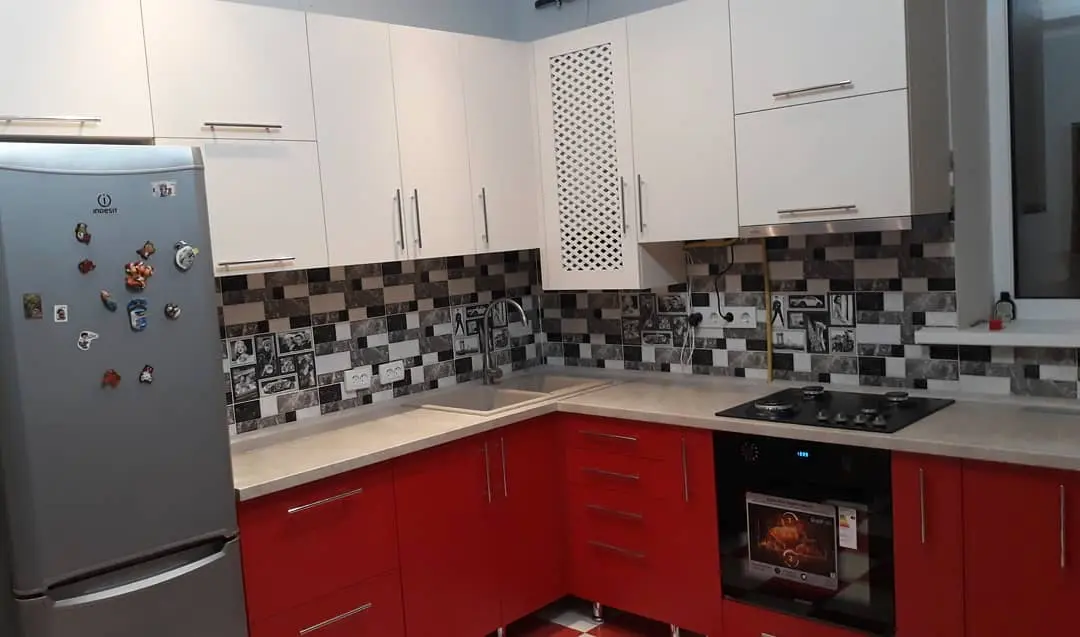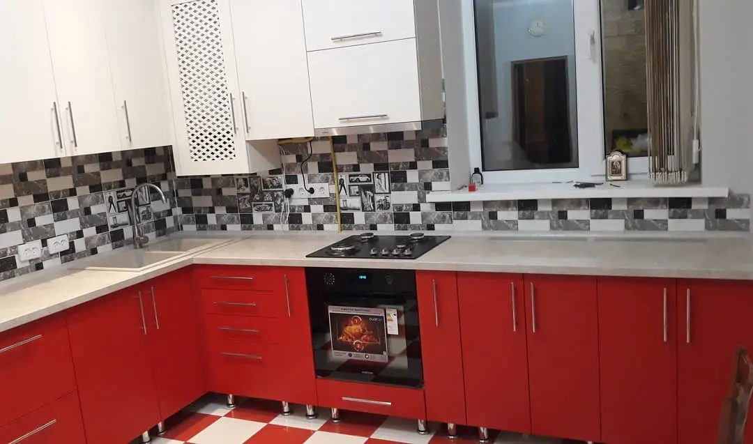 Кухня Кармина — стильное сочетание белых верхних фасадов и насыщенных красных нижних модулей. Угловая конфигурация делает пространство удобным и функциональным, а глянцевые поверхности визуально увеличивают помещение. Светлая столешница и чёрно-белый фартук добавляют гармонии и делают интерьер динамичным и современным.