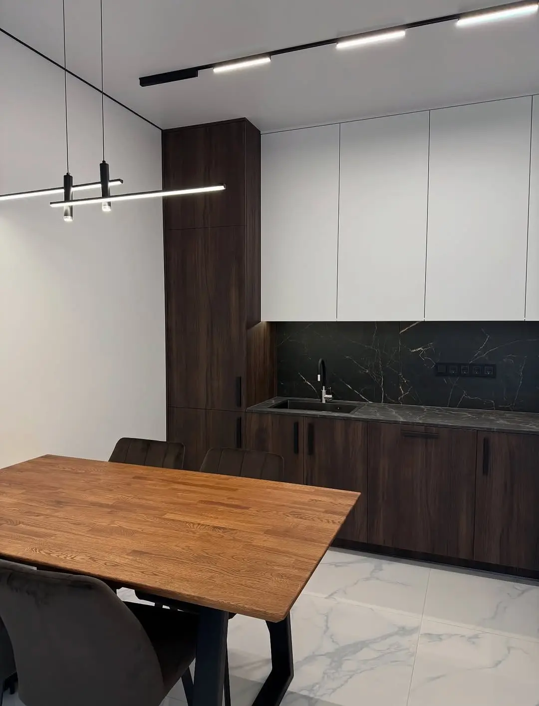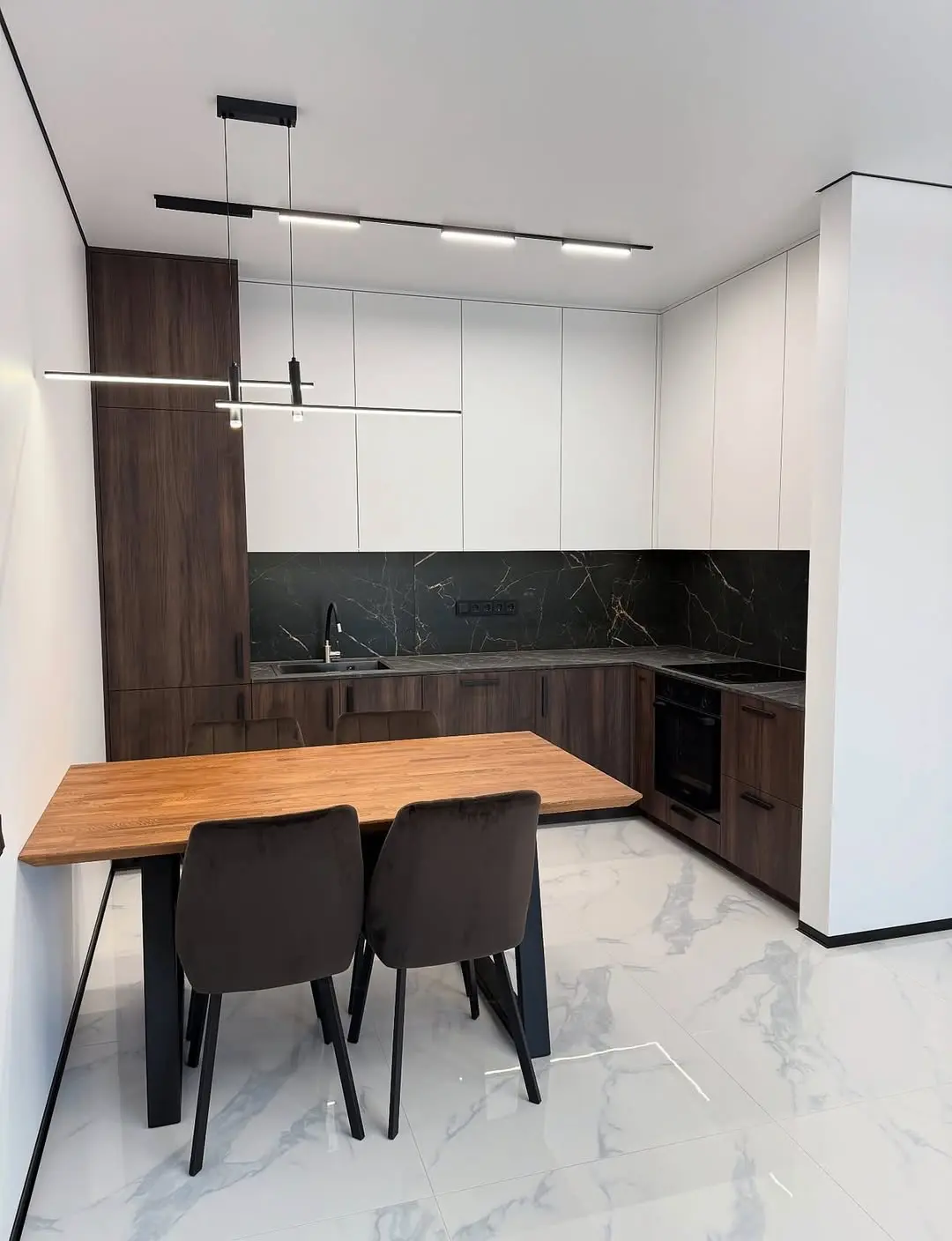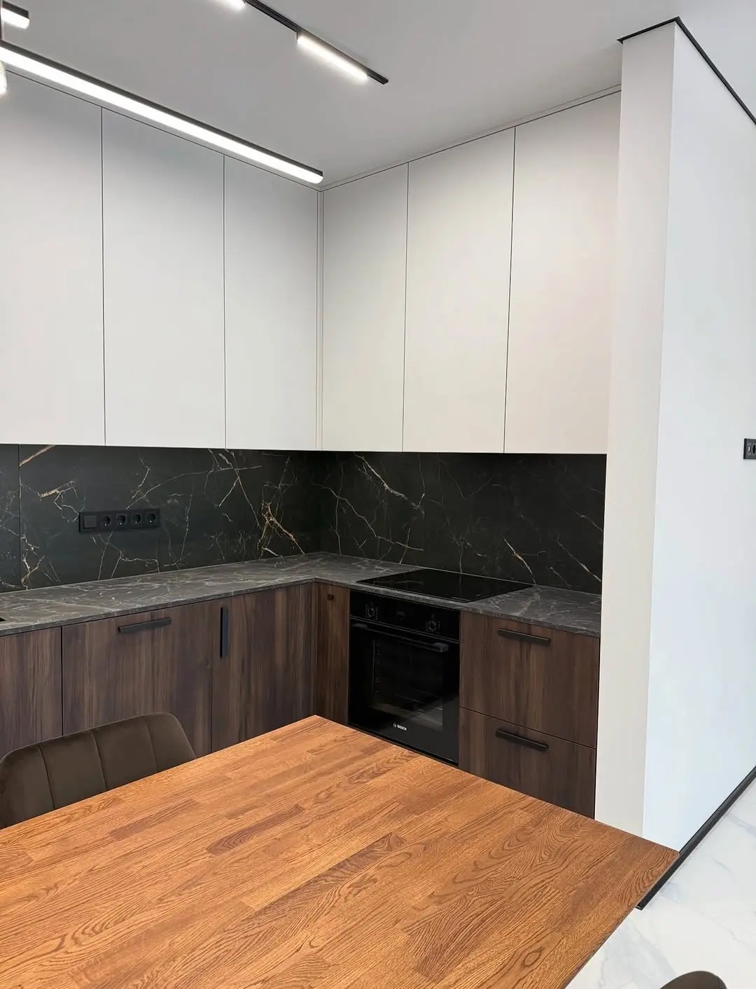 Кухня Лаурель сочетает тепло натурального дерева и лёгкость белых фасадов. Контрастные цвета подчёркивают современный минималистичный стиль, а фартук из тёмного камня с прожилками добавляет глубину и выразительность. Практичная угловая планировка делает пространство эргономичным и комфортным для ежедневного использования.