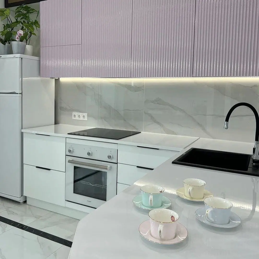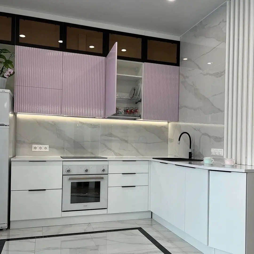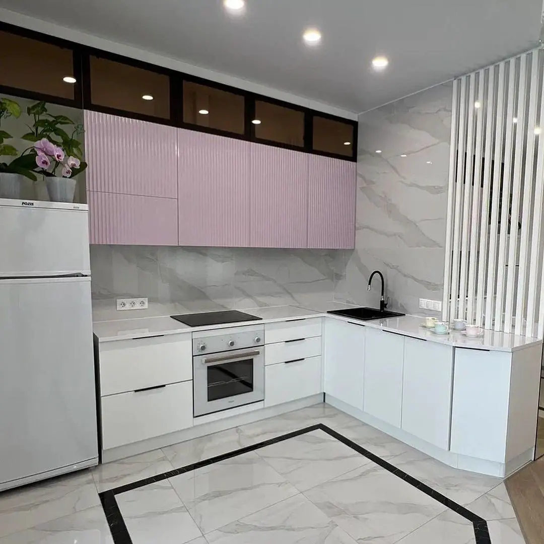 Кухня Лаванда — это современное сочетание белых фасадов и нежного розового глянца.