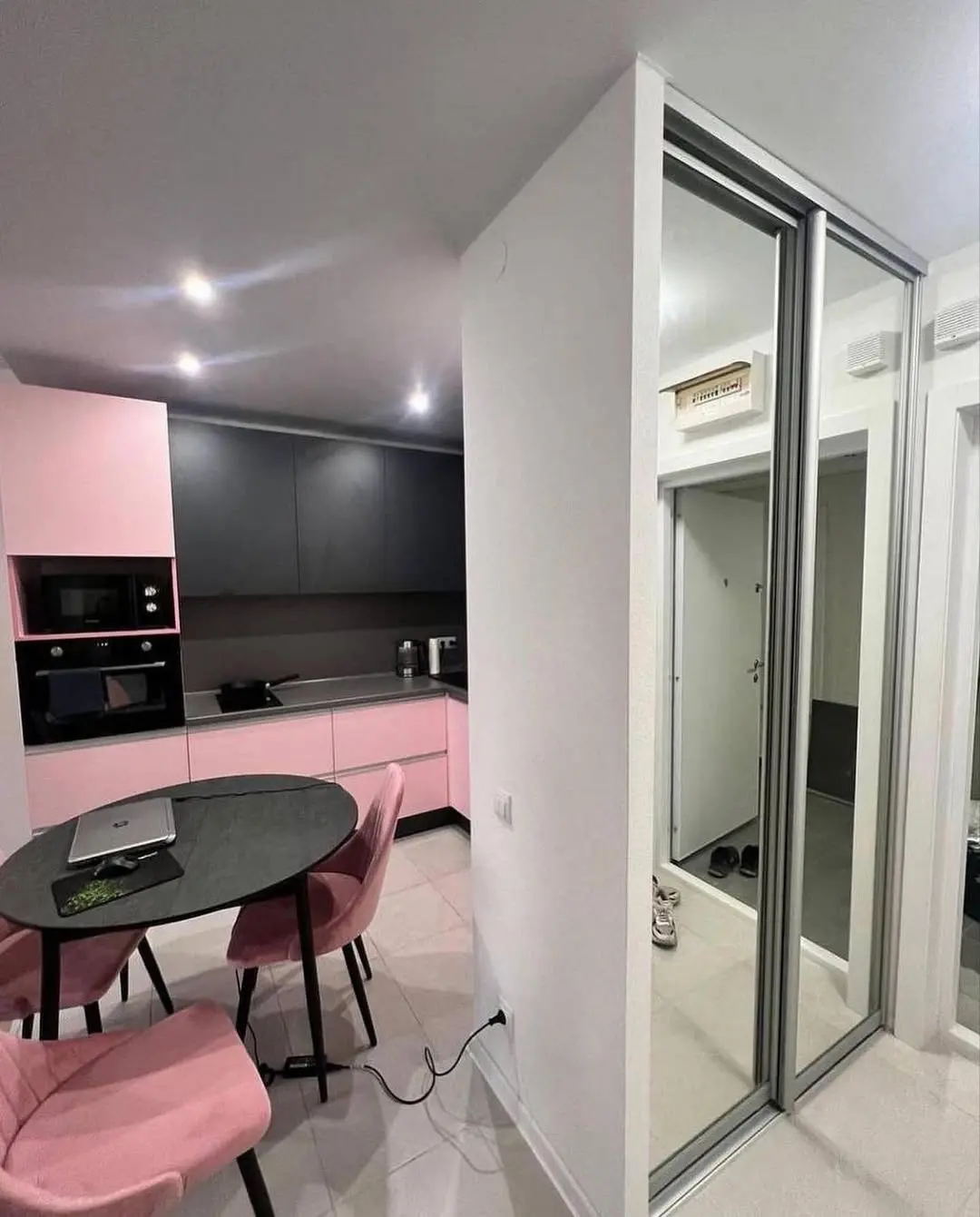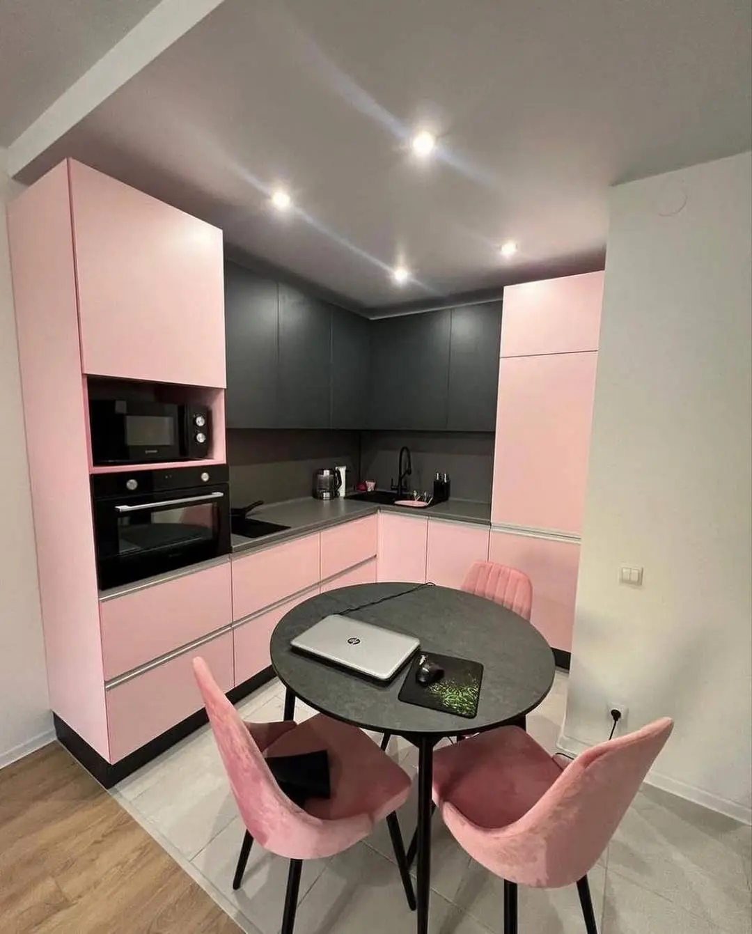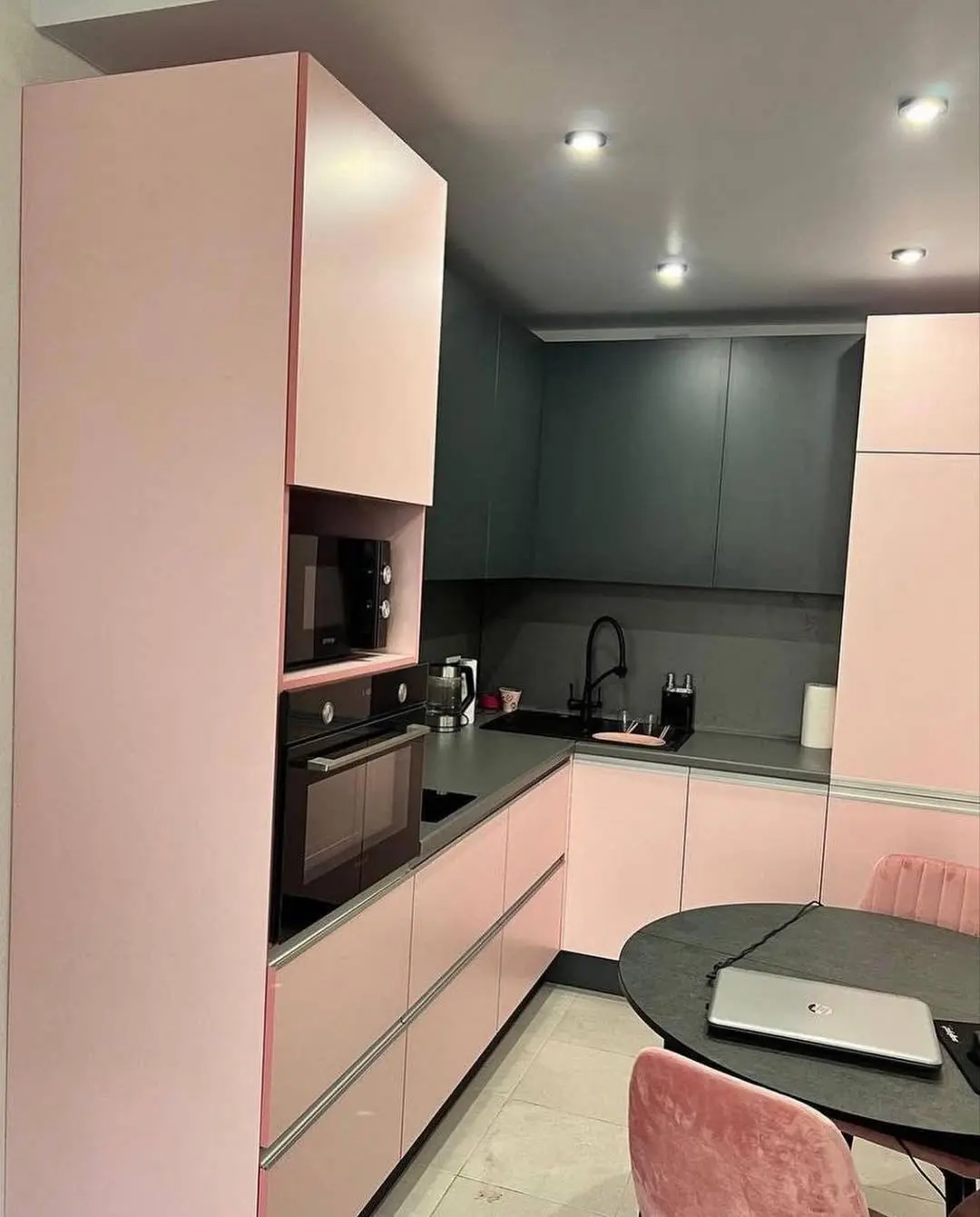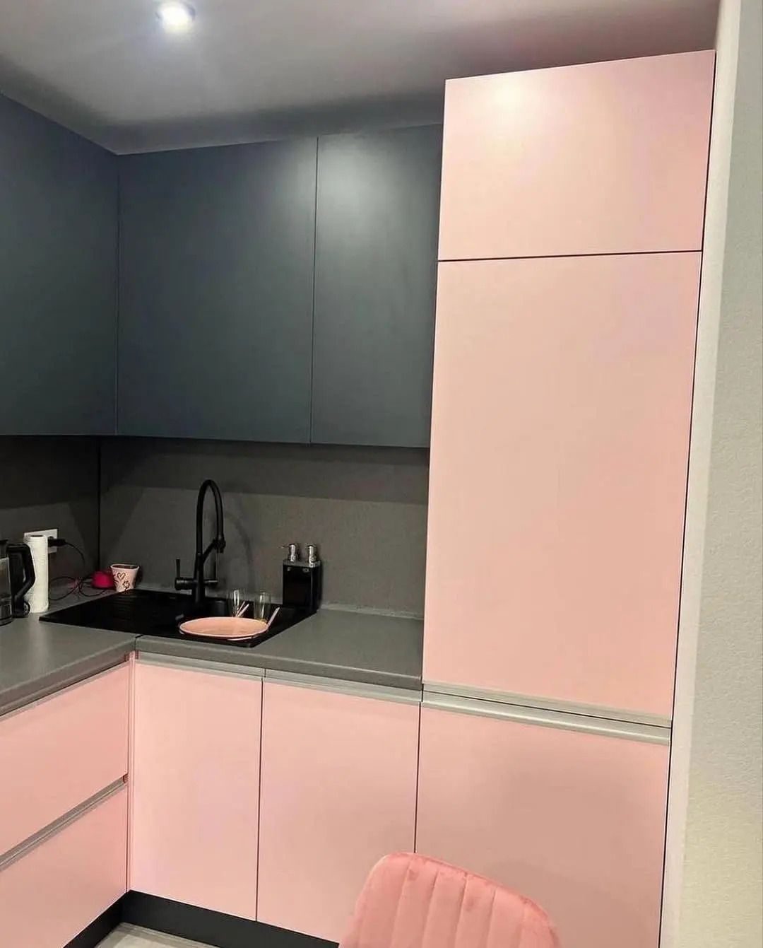 Кухня Лея — стильное сочетание мягкого розового и глубокого графитового оттенков. Контраст создаёт эффектную, но при этом уютную атмосферу, а минималистичные линии подчеркивают современный характер интерьера. Эргономичная планировка делает кухню удобной для повседневной готовки и отдыха.