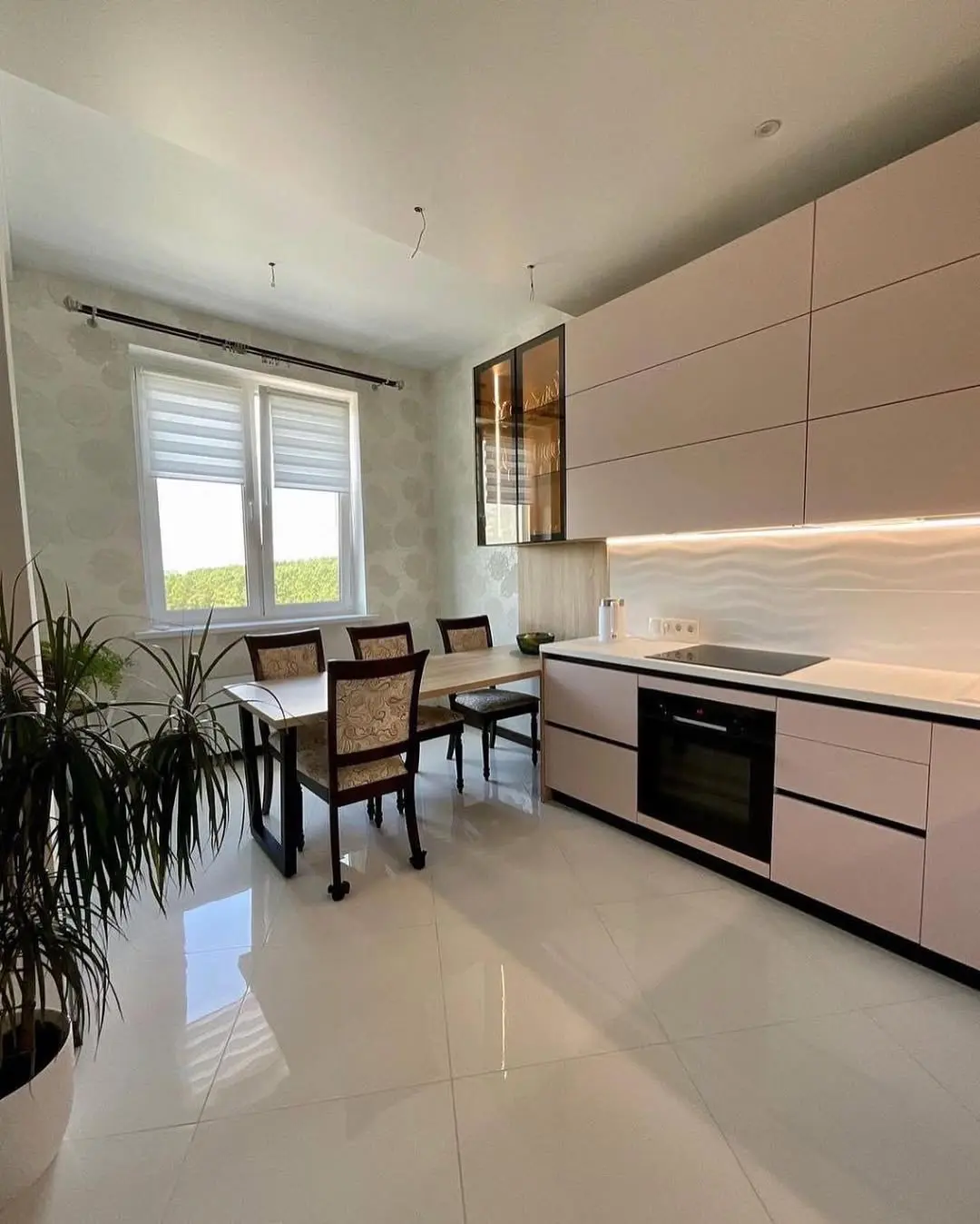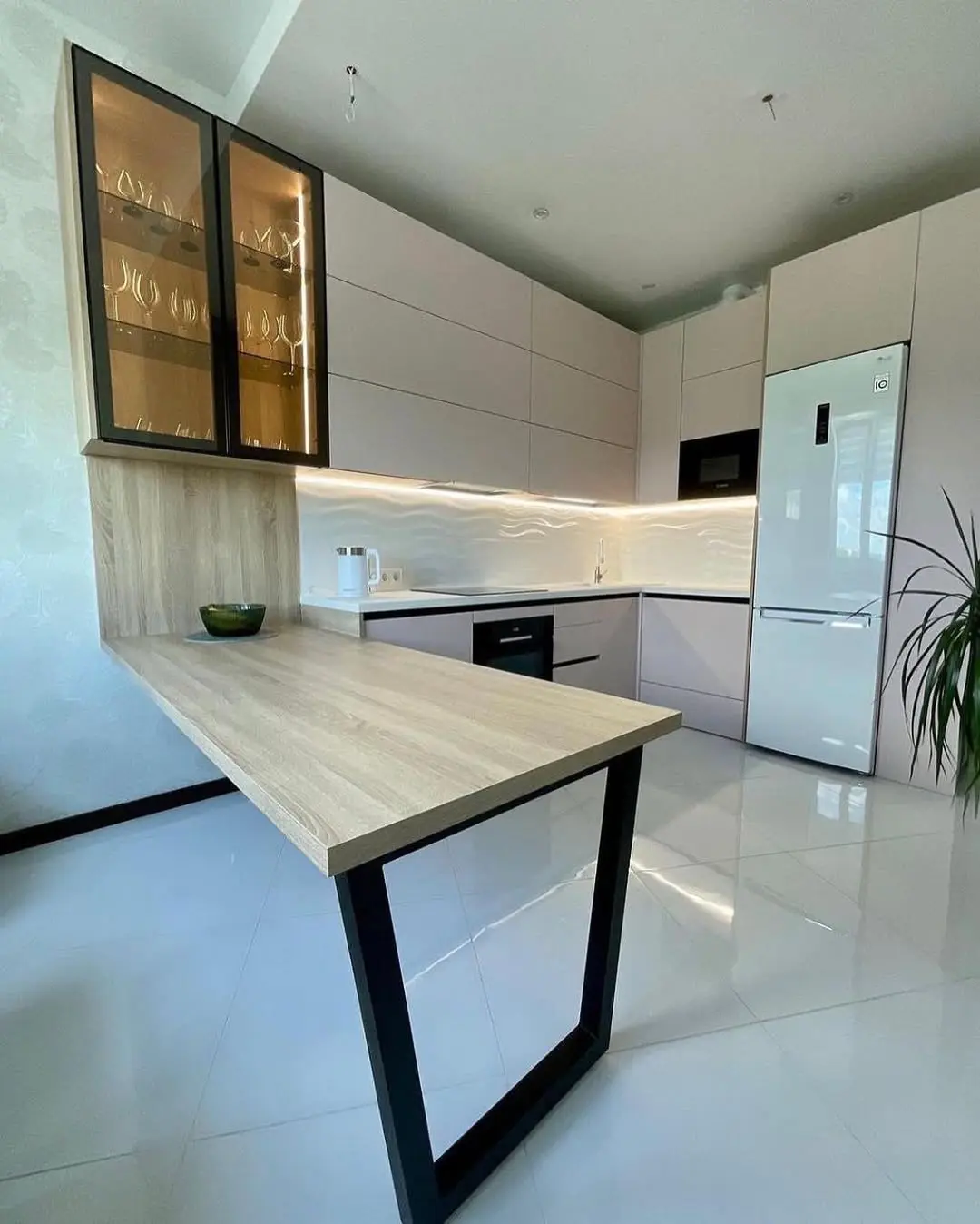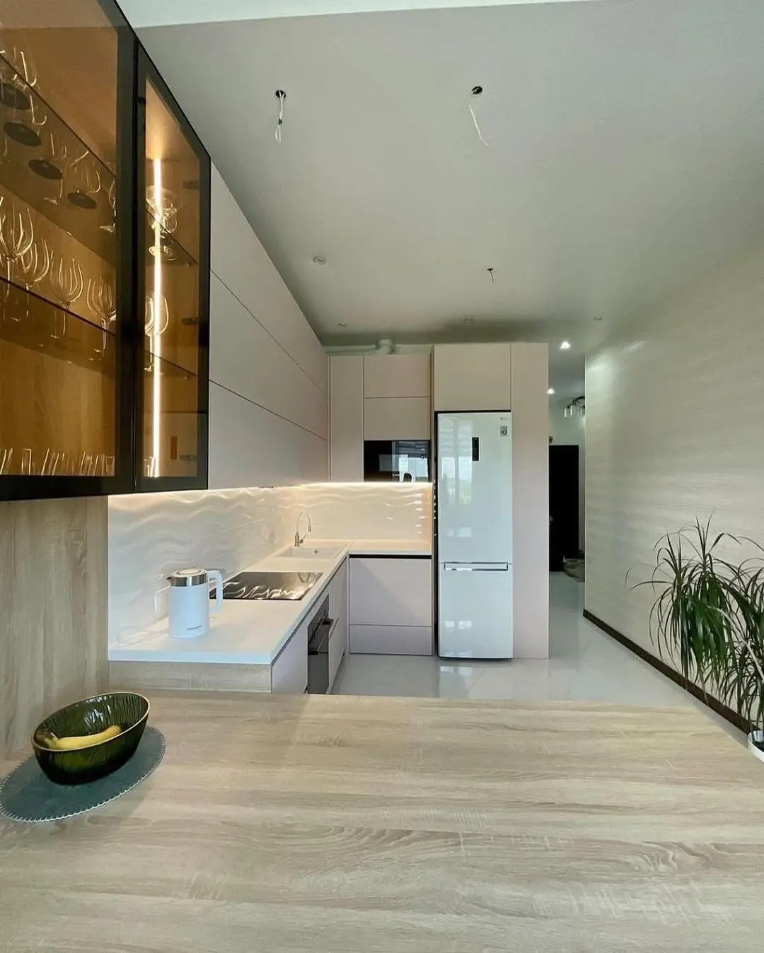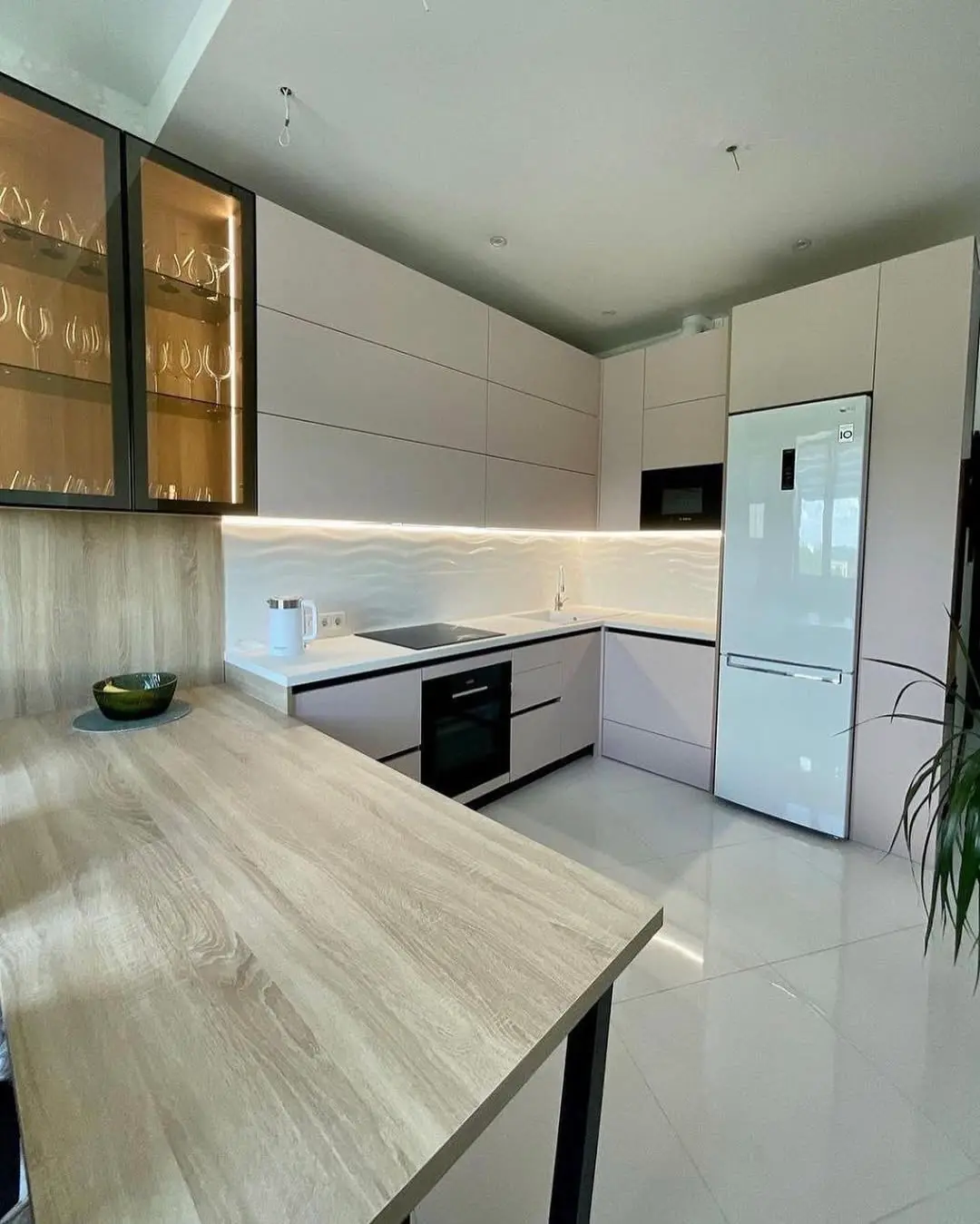 Комбинация матовой текстуры и светлого дерева создаёт уютную, но стильную атмосферу. Белый фартук с волнистым рельефом придаёт пространству свежесть, а барная стойка делает кухню практичной и функциональной.