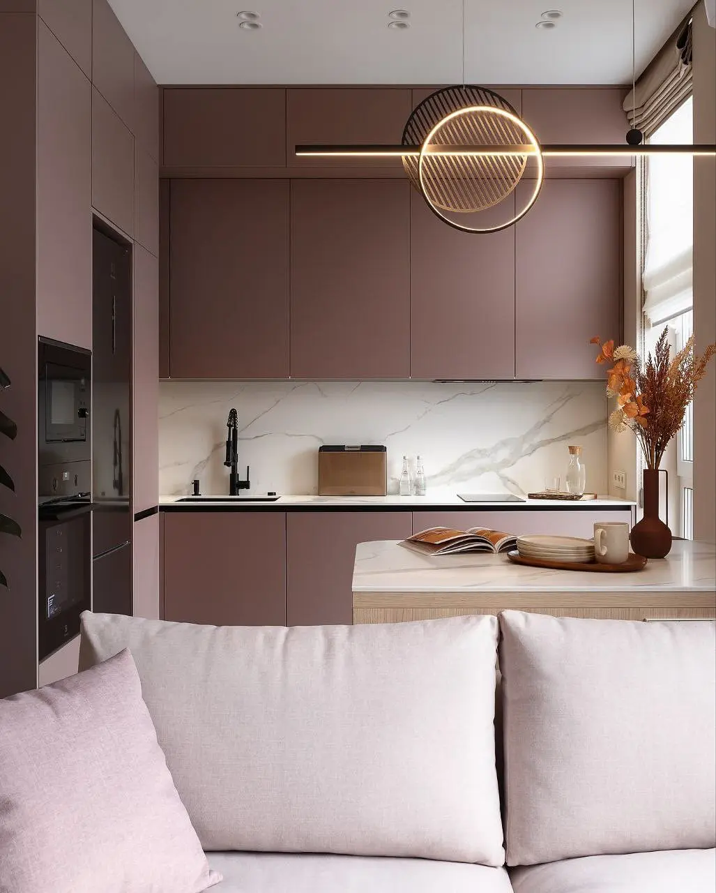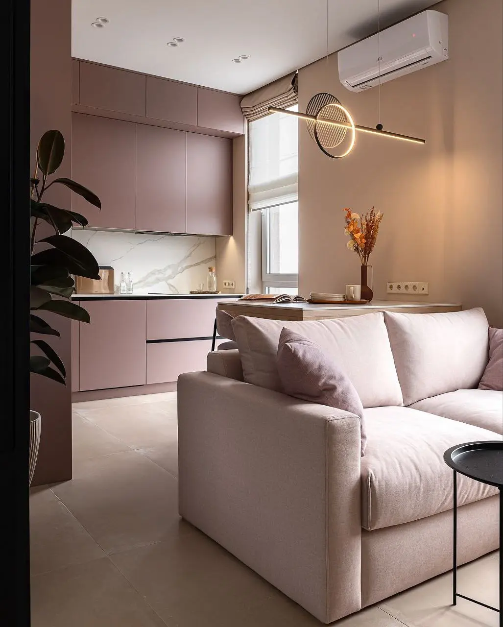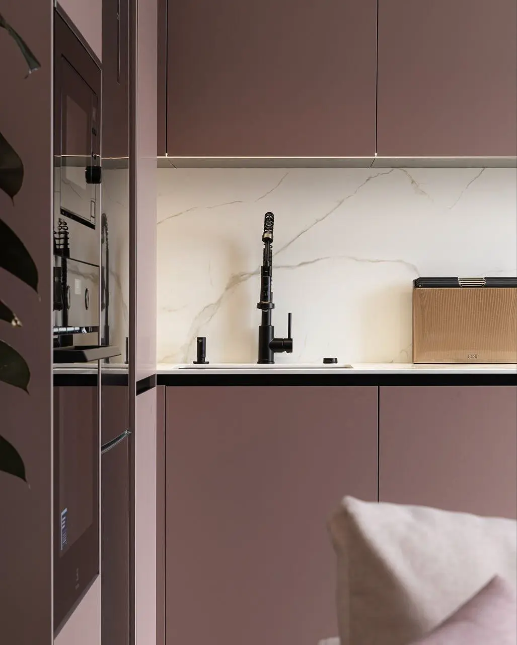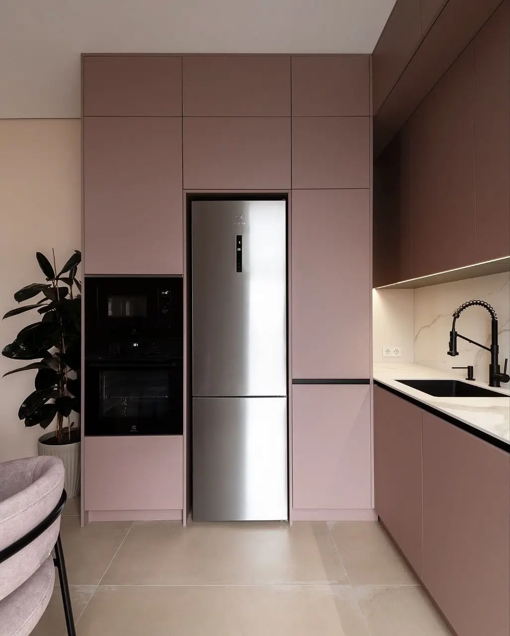 Кухня Лили — это гармония утончённости и практичности. Мягкий пудрово-розовый оттенок фасадов сочетается с белым мраморным фартуком, создавая лёгкую и тёплую атмосферу. Матовая эмаль придаёт интерьеру благородство, а лаконичный дизайн делает кухню идеальной для современного городского пространства.
