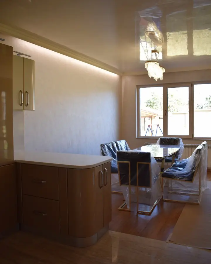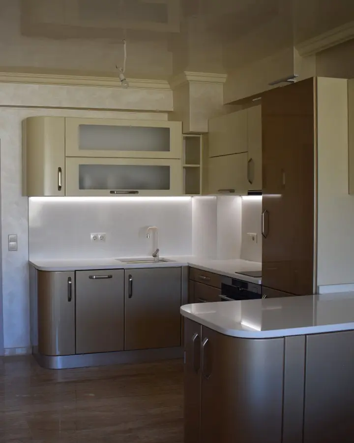 Кухня Люксора — это роскошная П-образная композиция в оттенках металлик и бежевого. Элегантные глянцевые фасады с плавными округлыми окончаниями создают атмосферу премиального интерьера. Светлая каменная столешница добавляет легкости, а мягкая подсветка делает пространство тёплым и уютным. Функциональное расположение модулей обеспечивает комфорт и максимальное удобство в использовании.