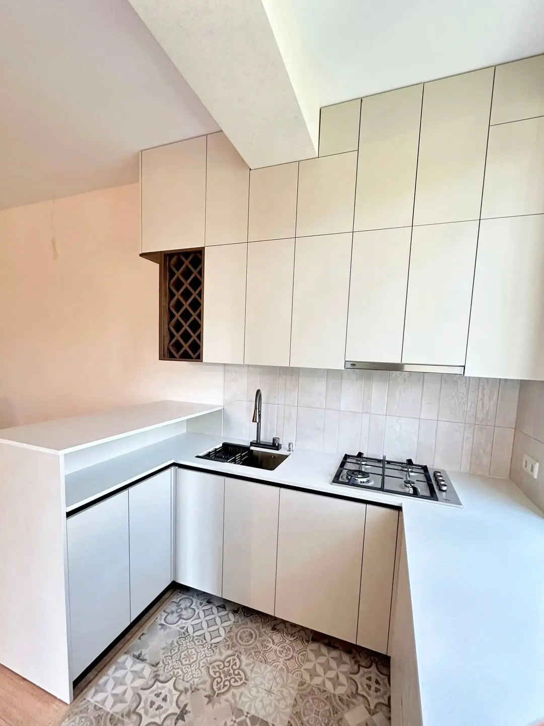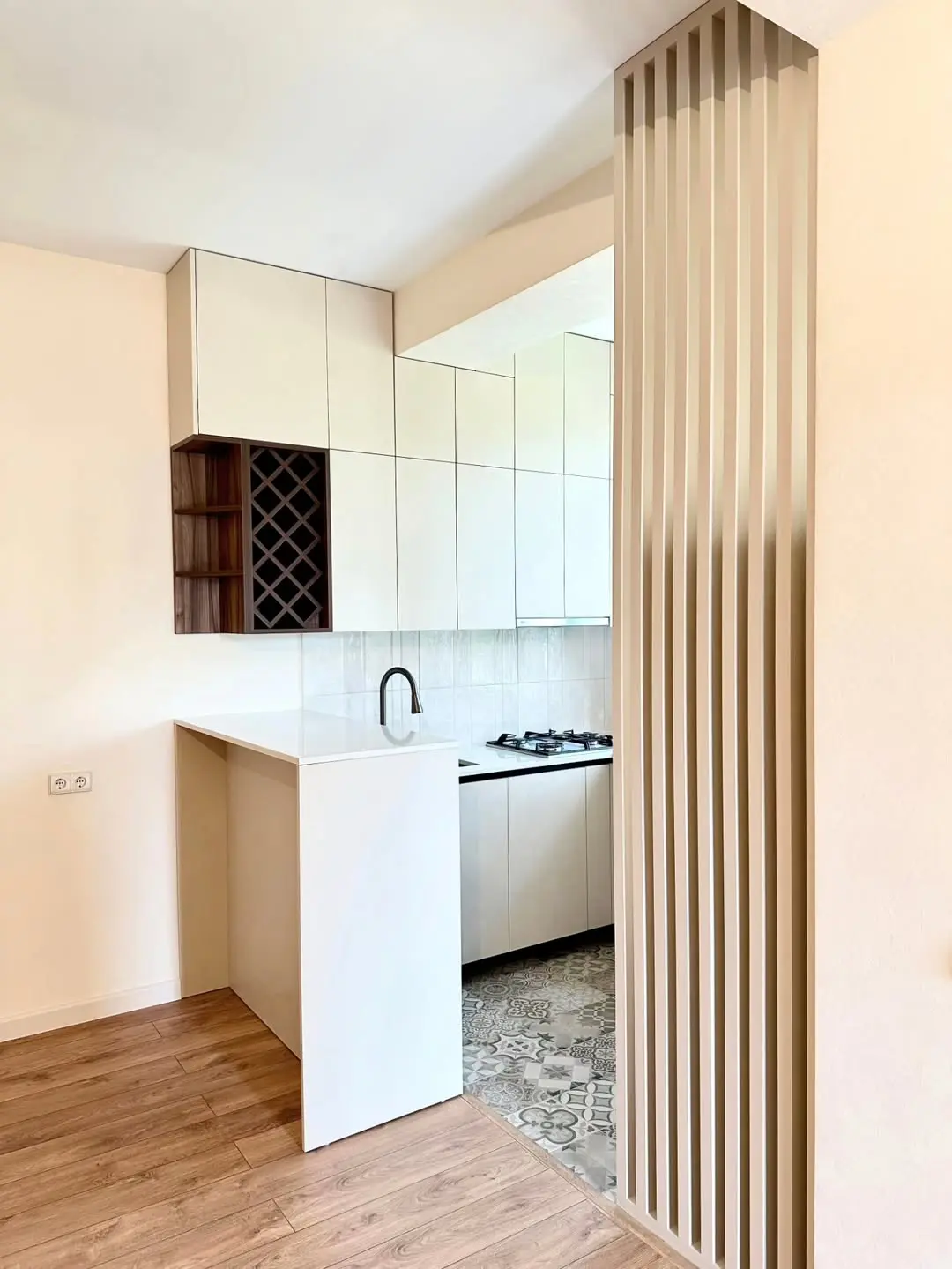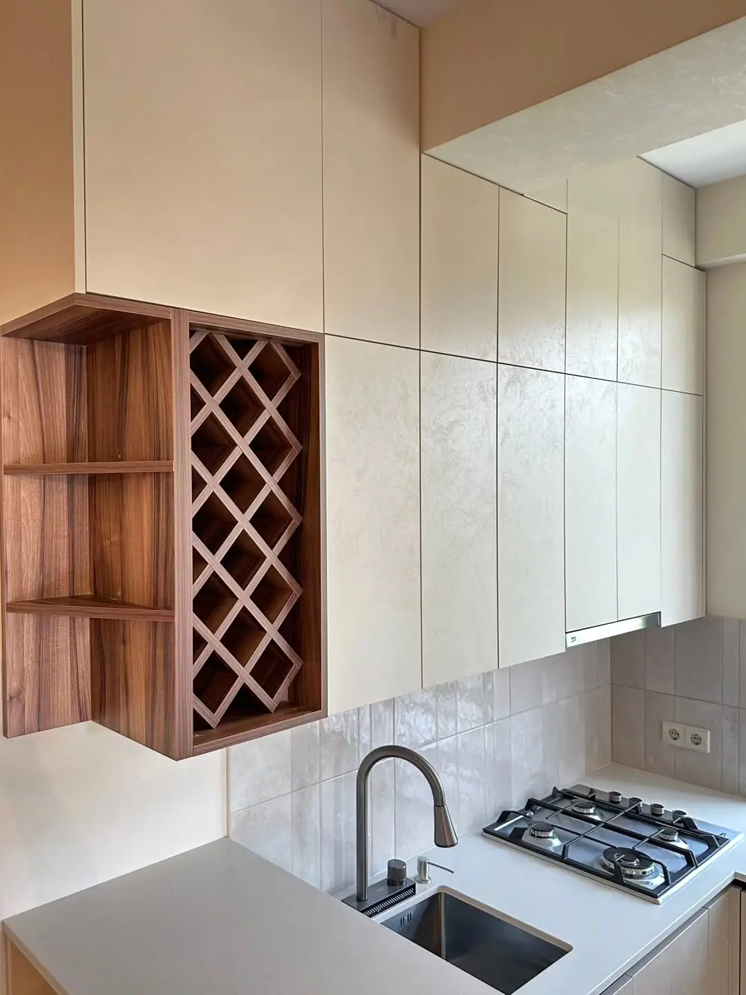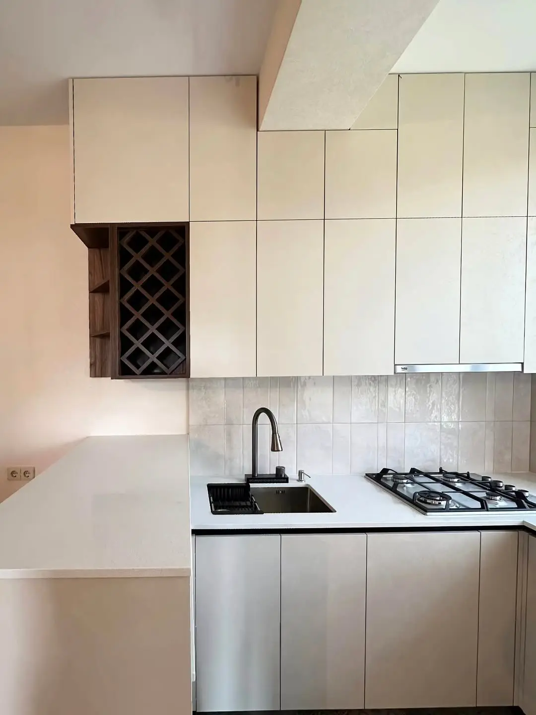 Кухня Мара — это гармоничное сочетание функциональности и элегантности в компактном пространстве. П-образная конфигурация делает зону готовки максимально удобной, создаёт дополнительную поверхность и больше места для хранения. Светлые фасады в оттенке айвори делают интерьер лёгким и воздушным, а деревянная винная полка добавляет тепла и индивидуальности. Матовые поверхности и скрытые ручки поддерживают стиль минимализма.