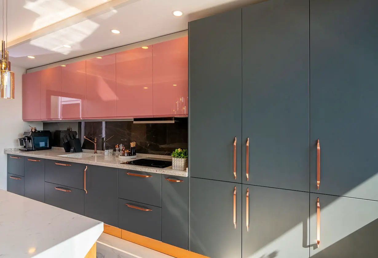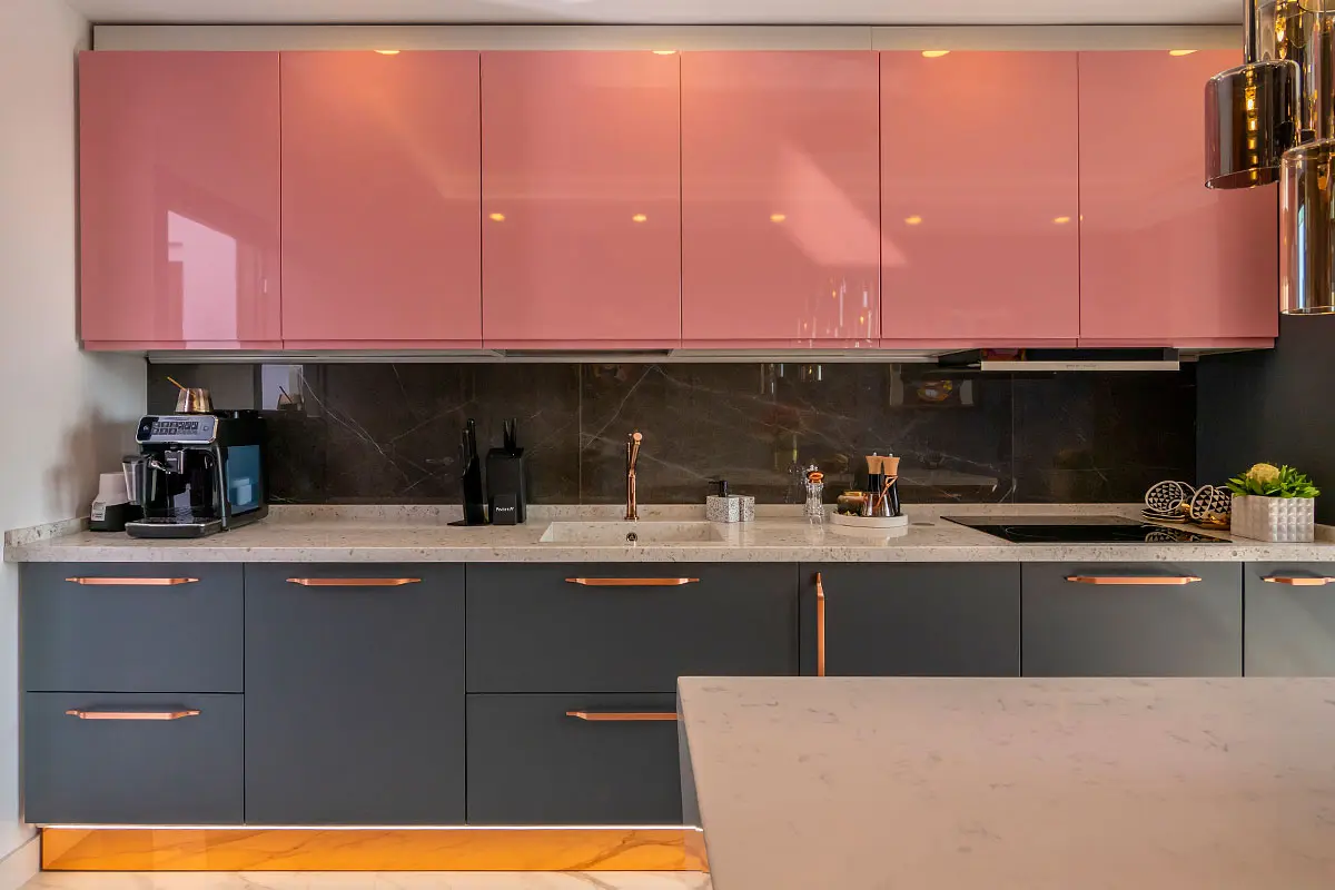 Глянцевые розовые фасады создают мягкое свечение, наполняя пространство теплом и лёгкостью, а нижний ярус в тёмно-сером матовом оттенке подчёркивает глубину интерьера. Медные ручки добавляют кухне изысканности и делают дизайн дорогим на вид. Контрастный фартук из графитового камня и светлая каменная столешница формируют гармоничную композицию, создавая идеальный баланс между смелостью и элегантностью.