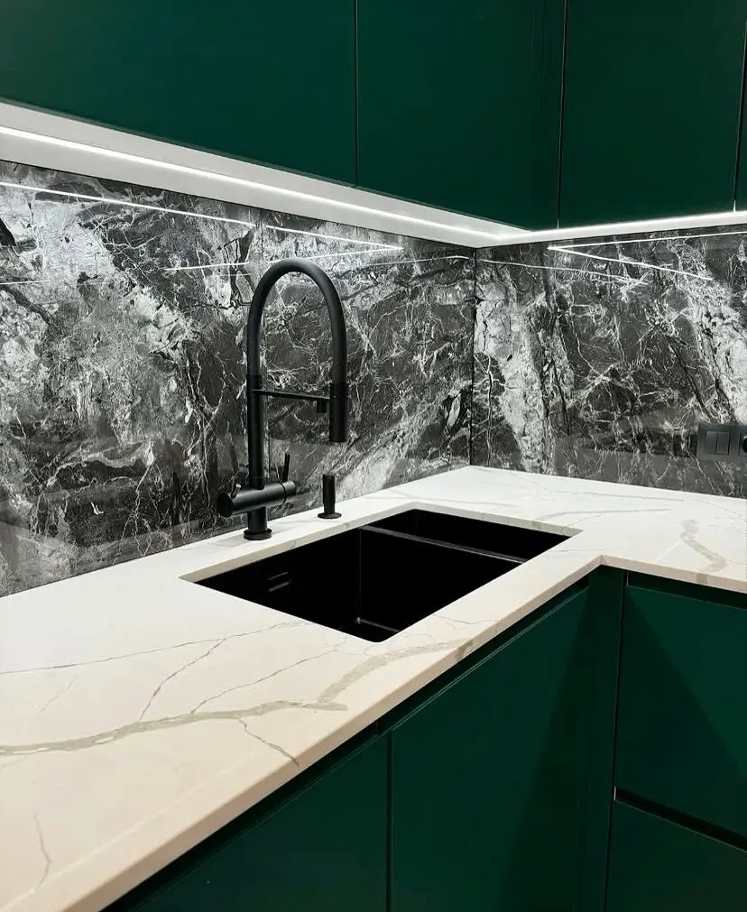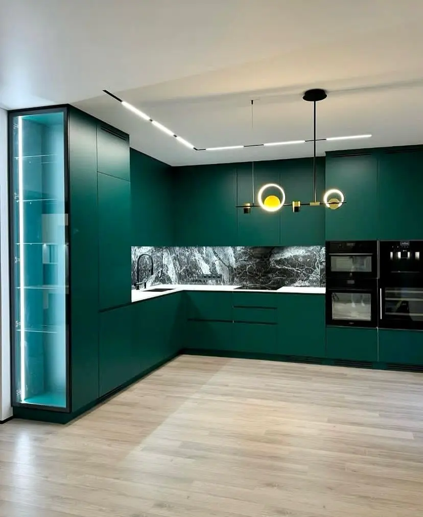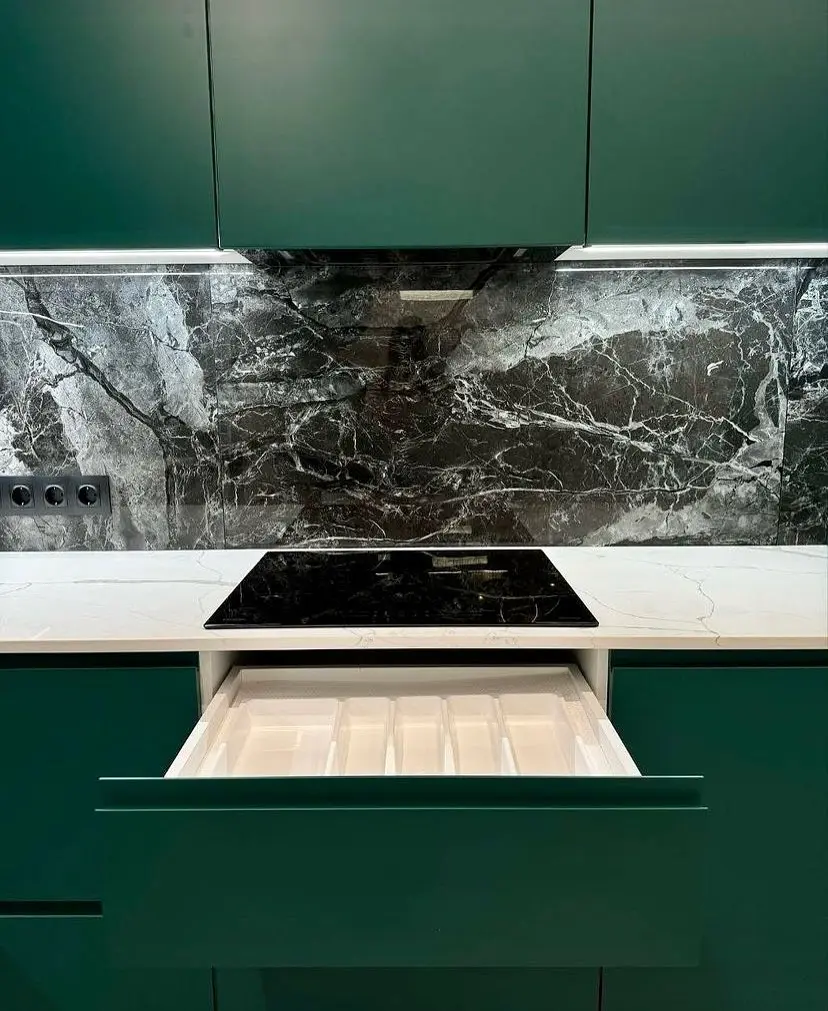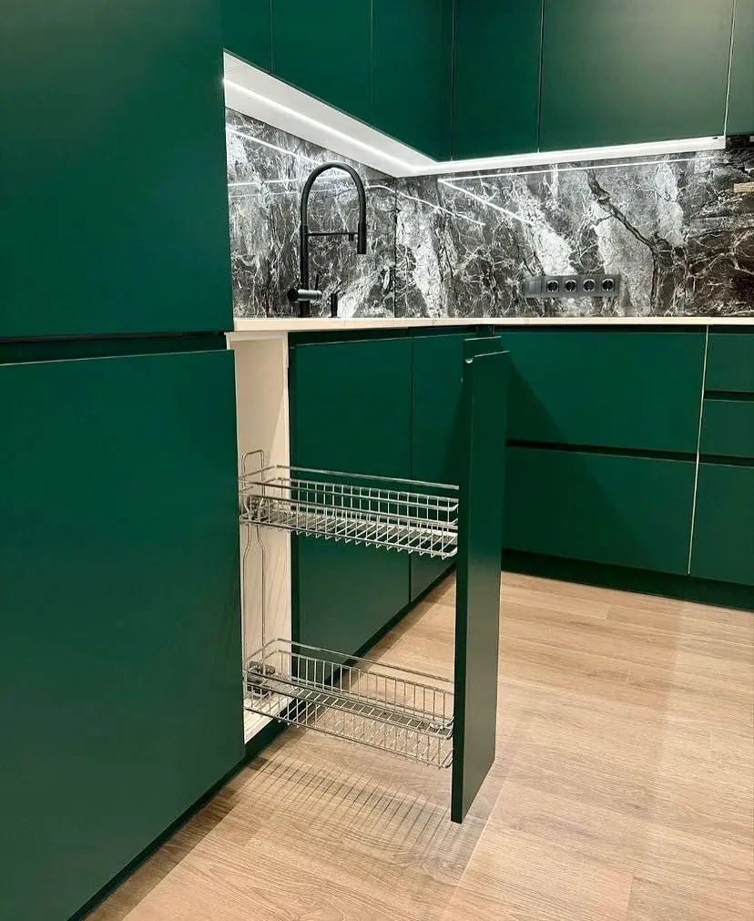 Кухня Мелина — современная, выразительная и технологичная. Угловая конфигурация делает рабочее пространство максимально удобным, создаёт продуманную эргономику и увеличивает полезную зону хранения. Глубокий зелёный оттенок фасадов создаёт премиальное настроение, а мраморный фартук с насыщенной текстурой добавляет интерьеру эффектности. Светлая столешница гармонично уравновешивает насыщенный цвет и визуально делает кухню легче. Матовые фасады, аккуратные линии и встроенная подсветка подчёркивают минималистичный стиль.