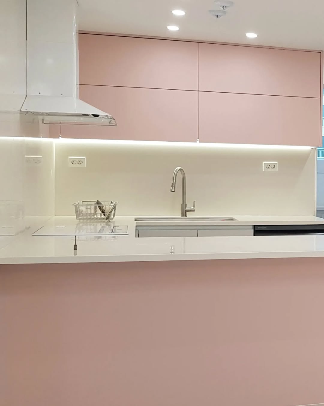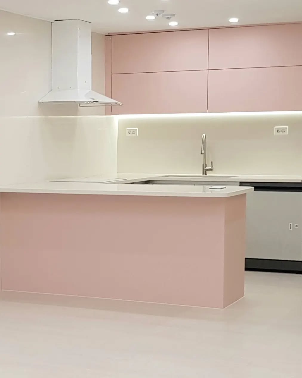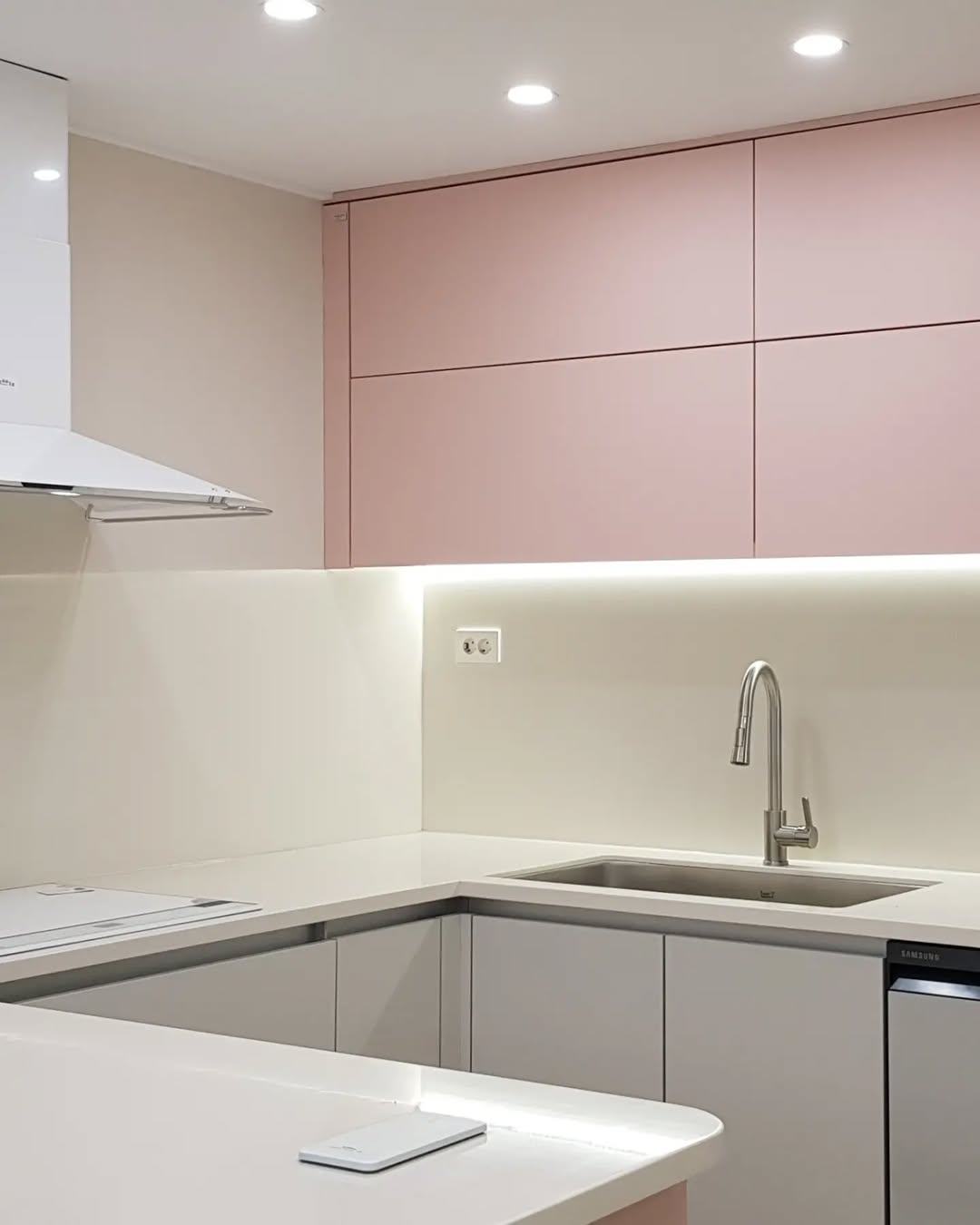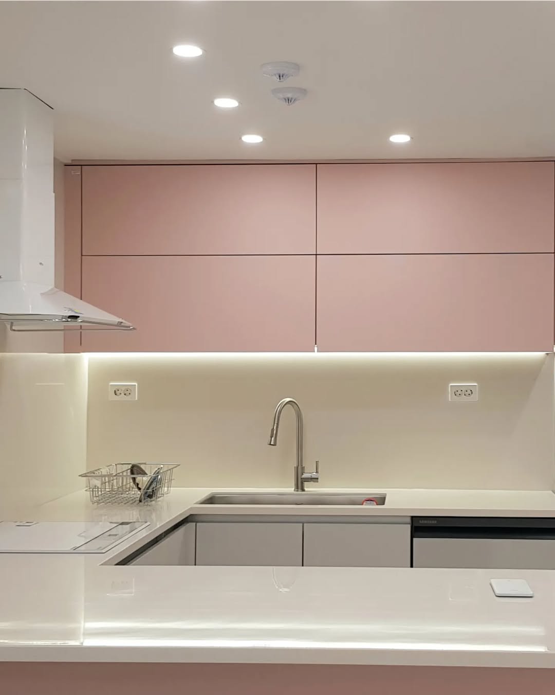 Кухня Мелроуз — воплощение нежности и функциональности. Комбинация матовых фасадов в белом и розовом оттенках создаёт атмосферу лёгкости и уюта. Барная стойка служит удобным местом для завтраков и встреч с близкими. Чистые линии, встроенная техника и лаконичное освещение подчёркивают современный минимализм интерьера.