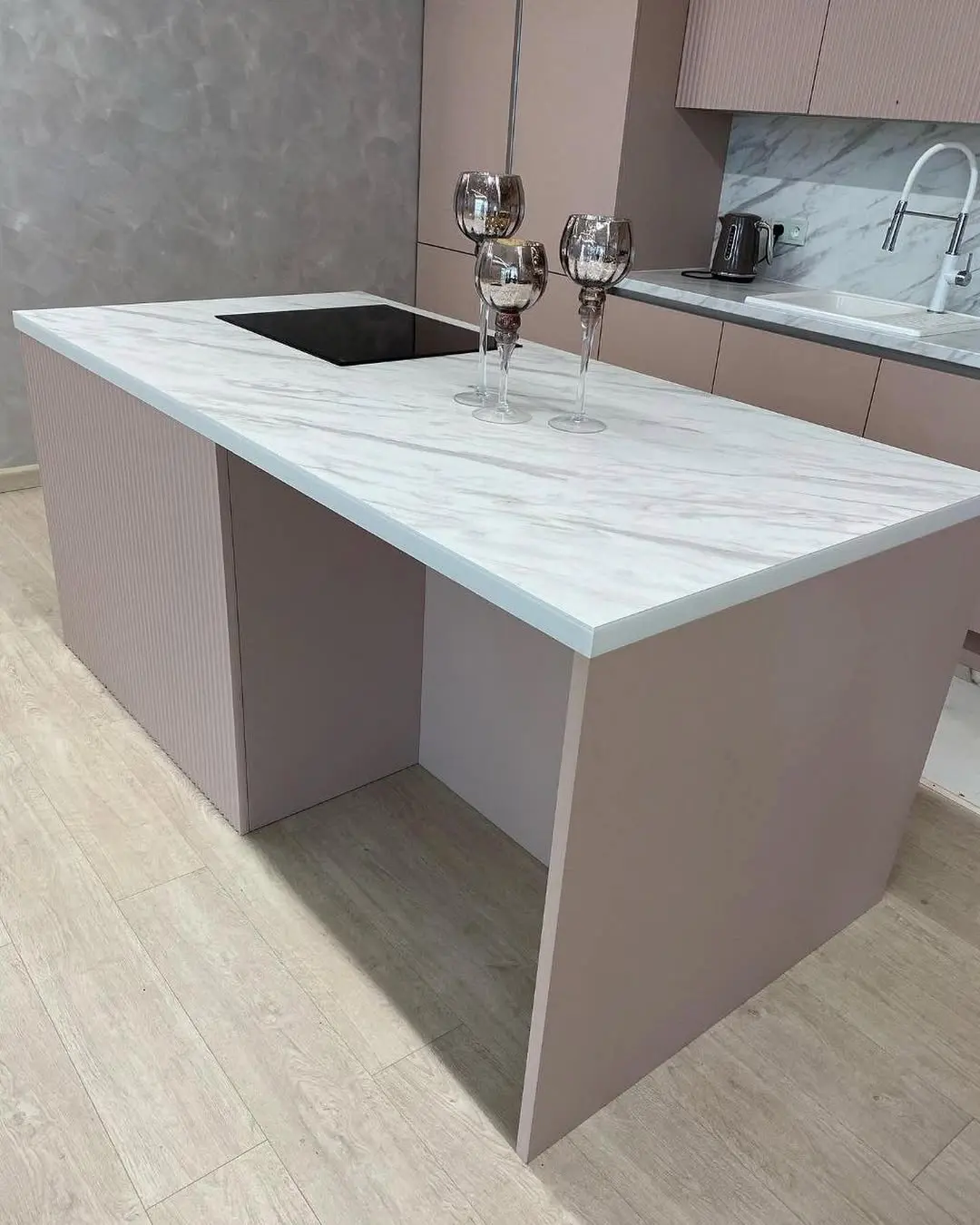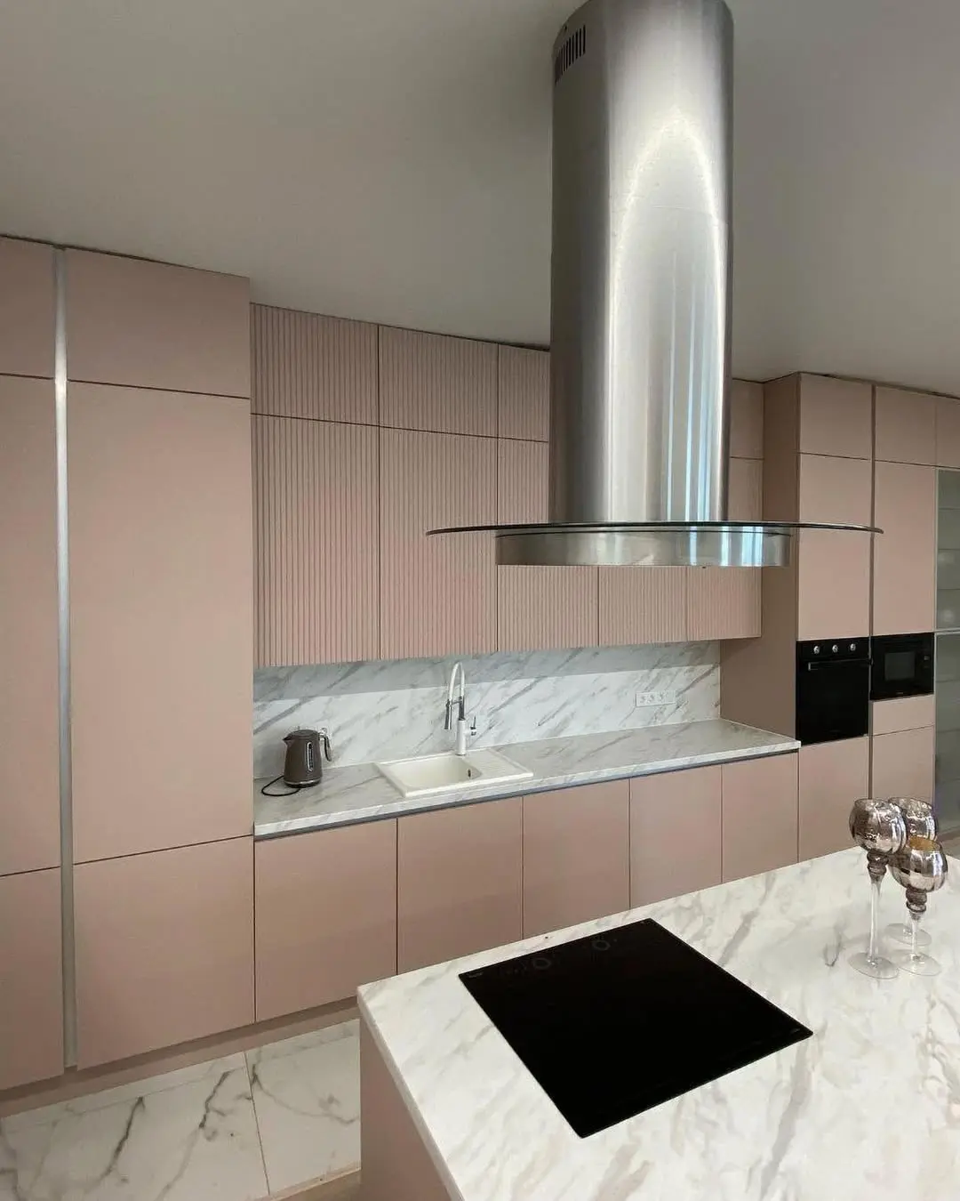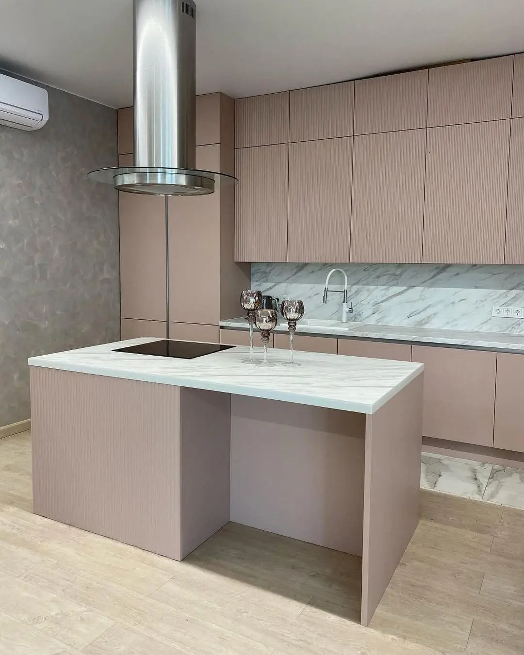Кухня Мокко — современное решение в мягком розовом оттенке. Матовые фасады с вертикальной фрезеровкой создают эффект лёгкости и гармонии, а мраморная столешница и фартук добавляют интерьеру изысканности. Центральный остров служит удобным местом для готовки и лёгких приёмов пищи, подчёркивая современный минималистичный стиль.