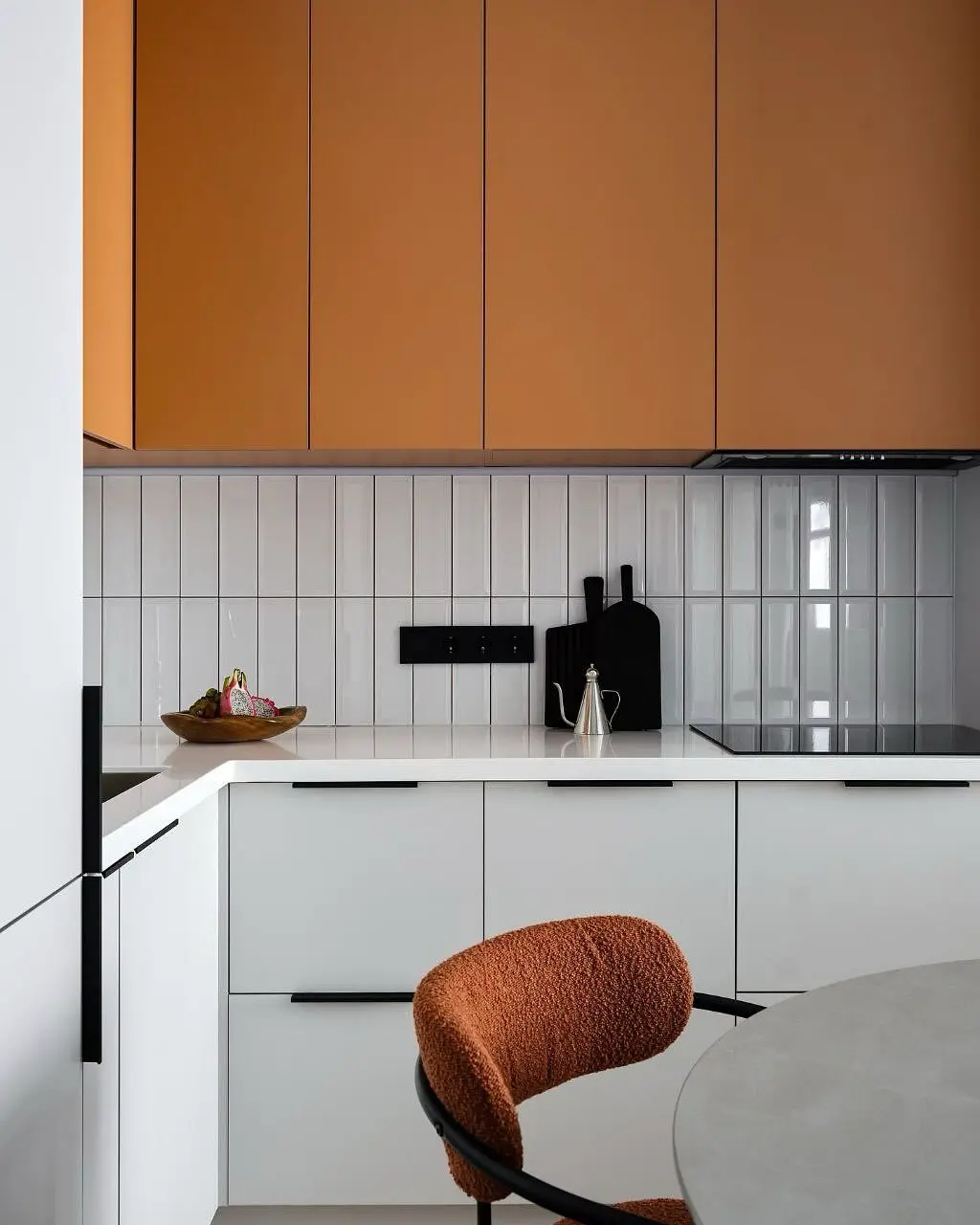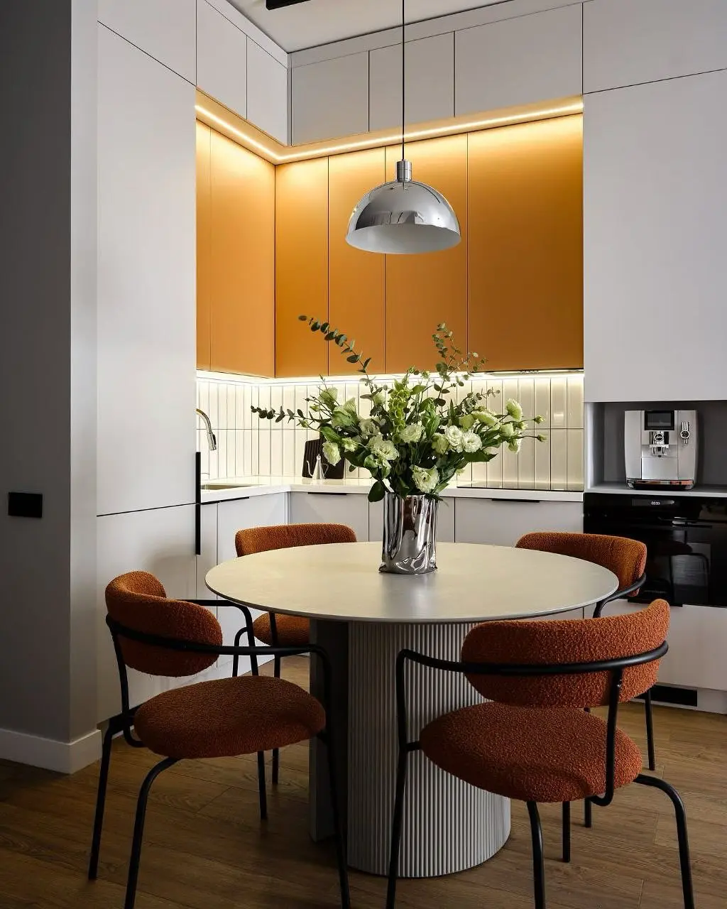 Угловая кухня в минималистичном современном стиле с белыми матовыми фасадами и яркими оранжевыми акцентами на стенах, стульях и декоре. Центральный элемент — круглый белый стол с обитыми оранжевыми стульями, окружённый свежими цветами и зелёными ветвями в вазе. Подсветка вдоль шкафов и подвесной светильник создают тёплую атмосферу, подчёркивая функциональность пространства для готовки и семейных ужинов. Зона идеально подходит для небольших помещений, где сочетается стиль и практичность.