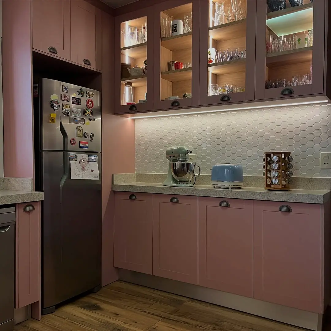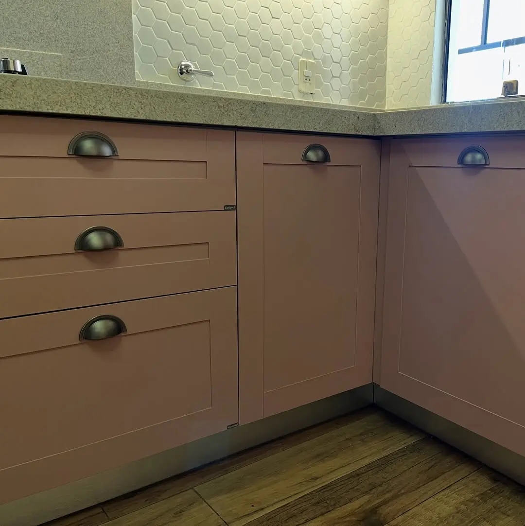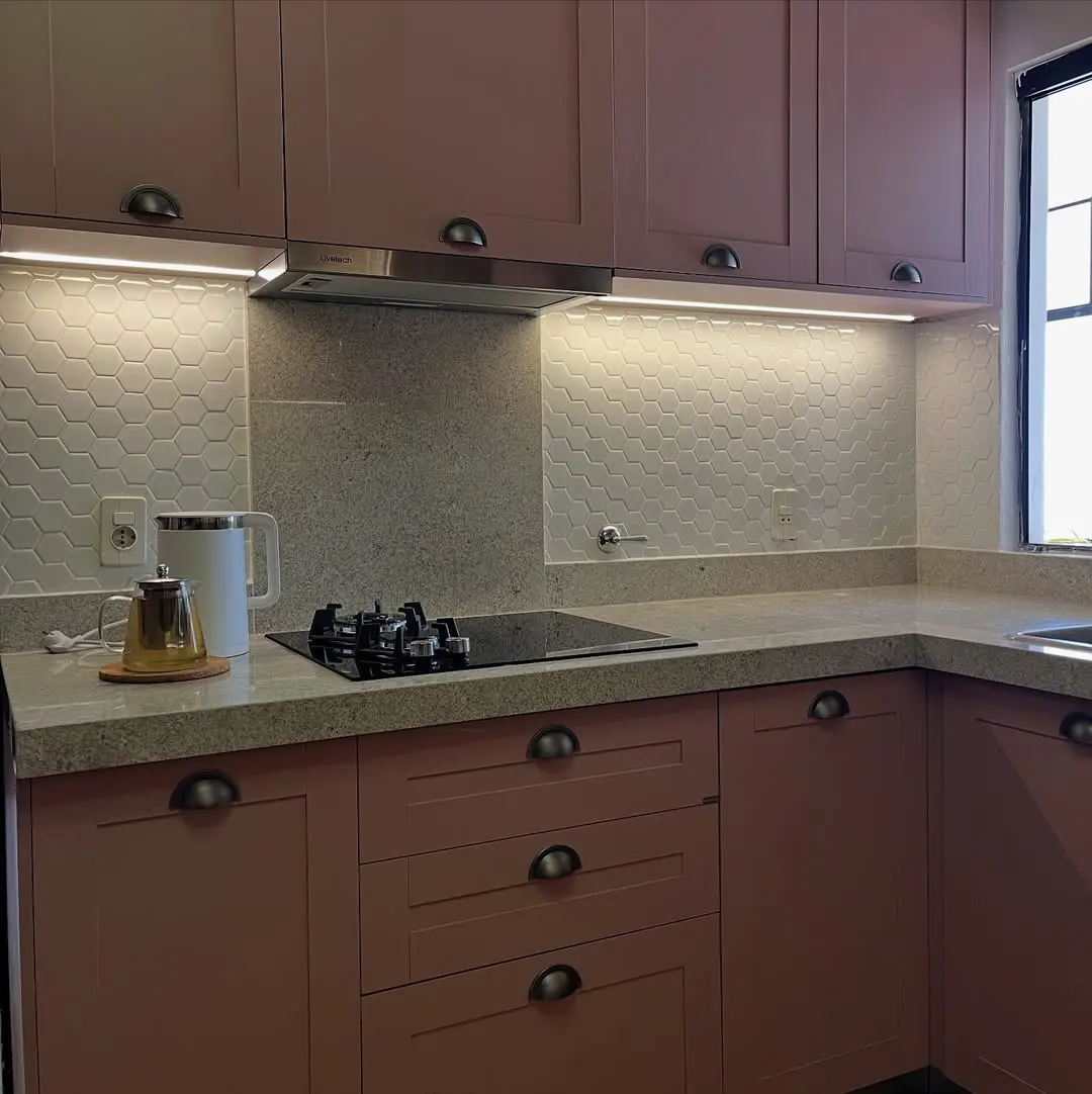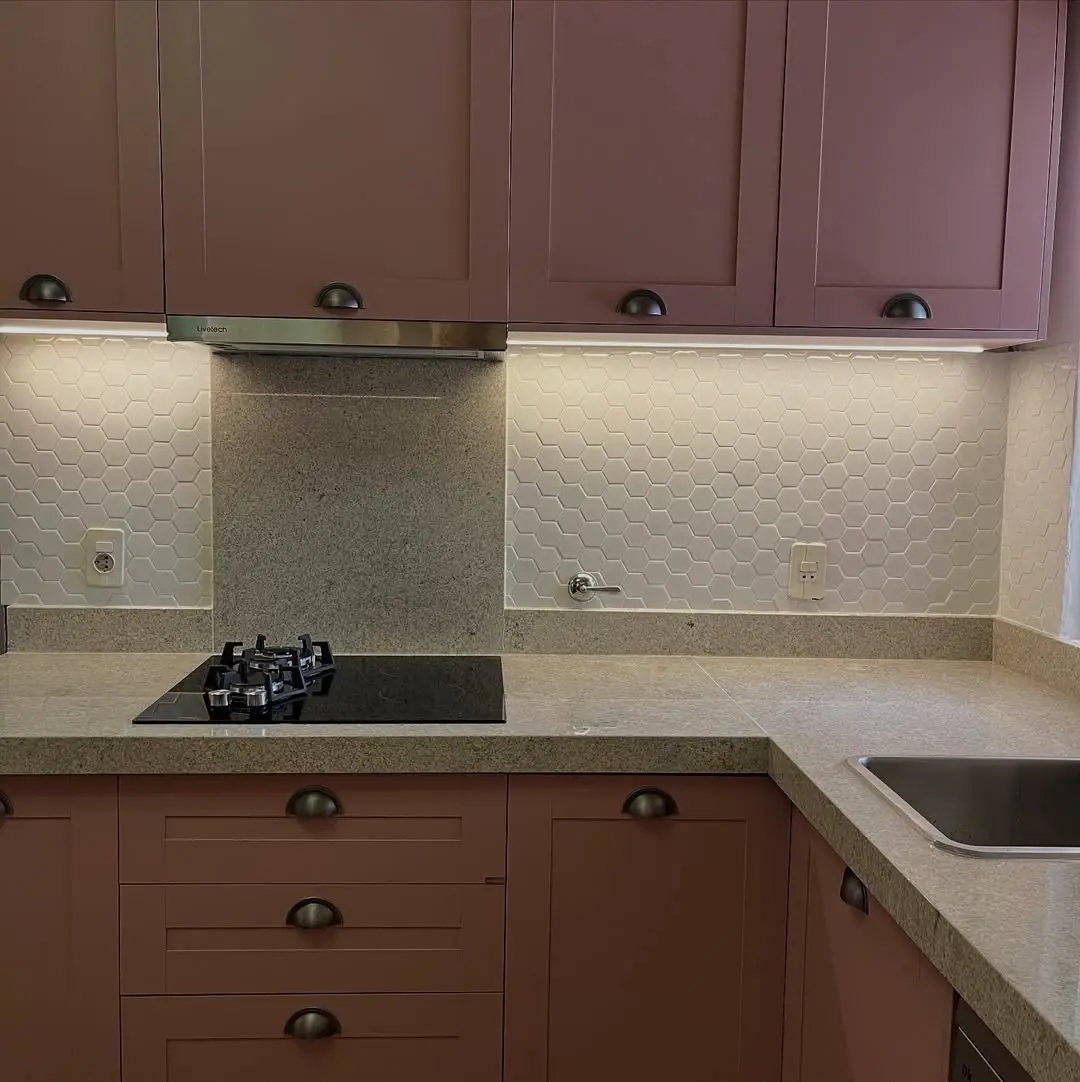 Кухня Роузберри — изысканное сочетание нежного розового цвета и сдержанного каменного оттенка столешницы. Классические фасады с лёгкой фрезеровкой создают уют и утончённость, а светлый фартук из плитки “соты” добавляет пространству фактуры и визуальной лёгкости. Практичная угловая планировка идеально подойдёт для уютных квартир и домов с семейной атмосферой.