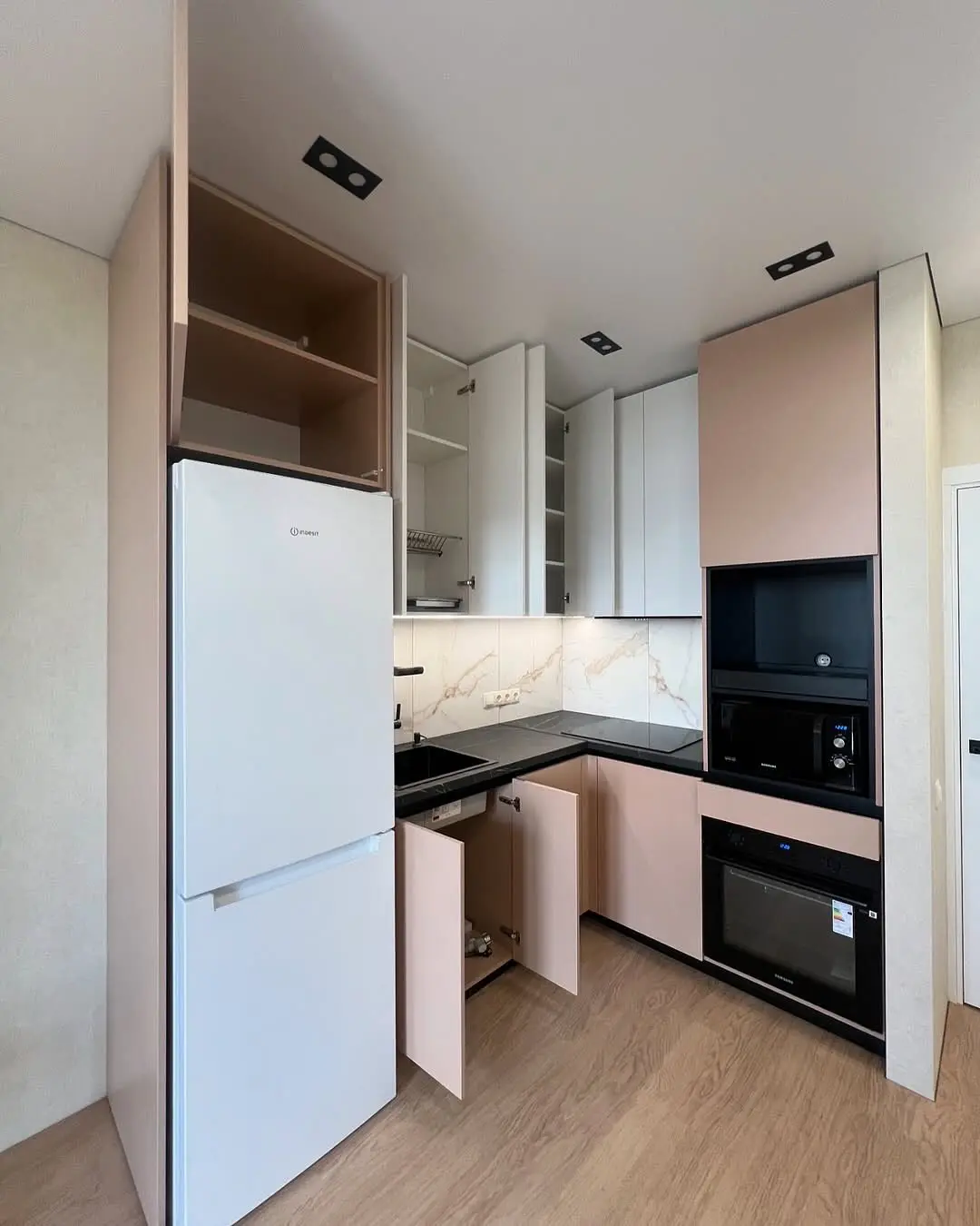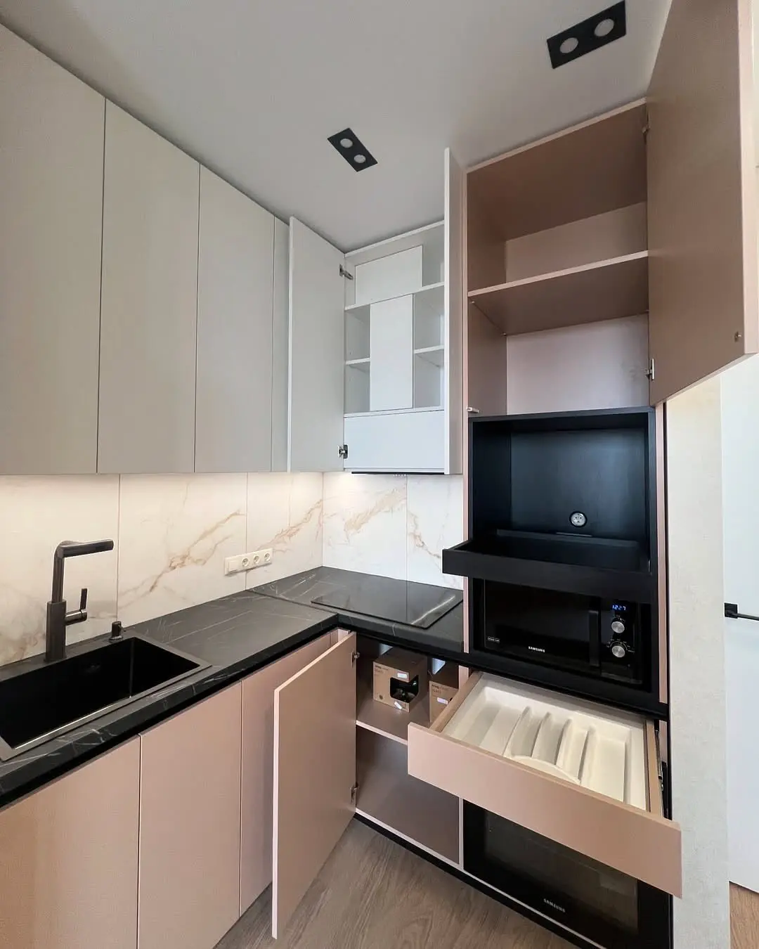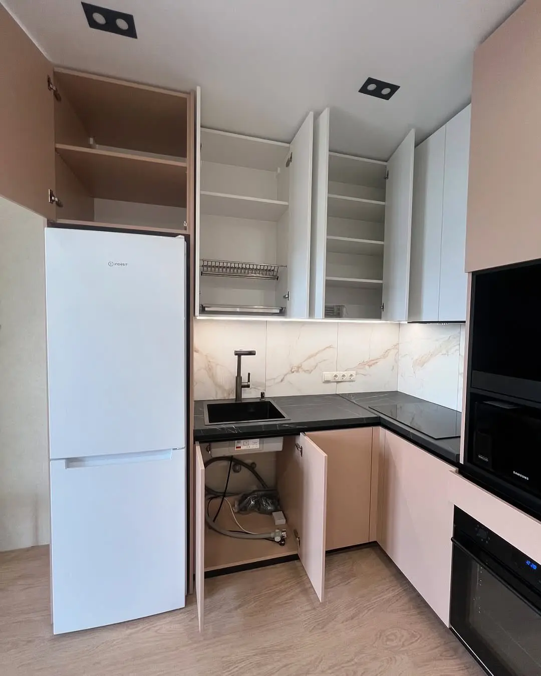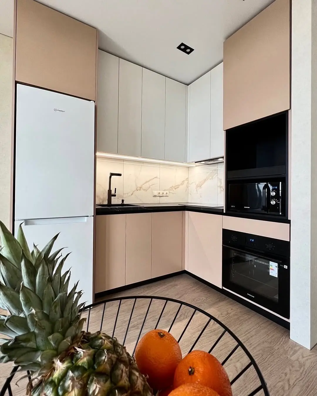 Кухня Рози сочетает в себе нежный розовый оттенок и белые матовые фасады, создавая лёгкий и современный образ. Чёрная столешница под мрамор добавляет интерьеру выразительности и контраста. Угловая форма обеспечивает удобство в работе и рациональное использование пространства. Такой дизайн станет идеальным решением для современных квартир, где важны комфорт и стиль.