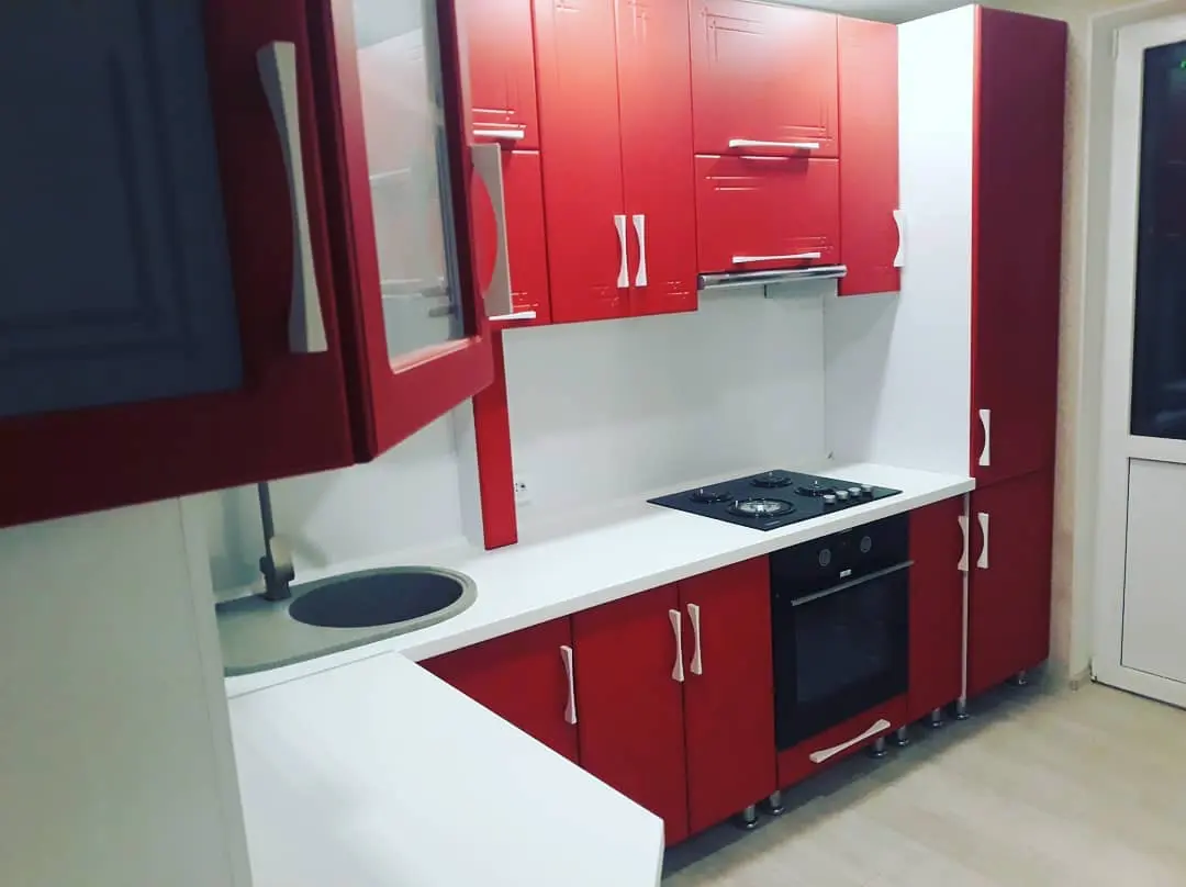 Глянцевые красные фасады создают эффект глубины и делают пространство современным, а белый верх визуально облегчит композицию и добавит чистоты.
