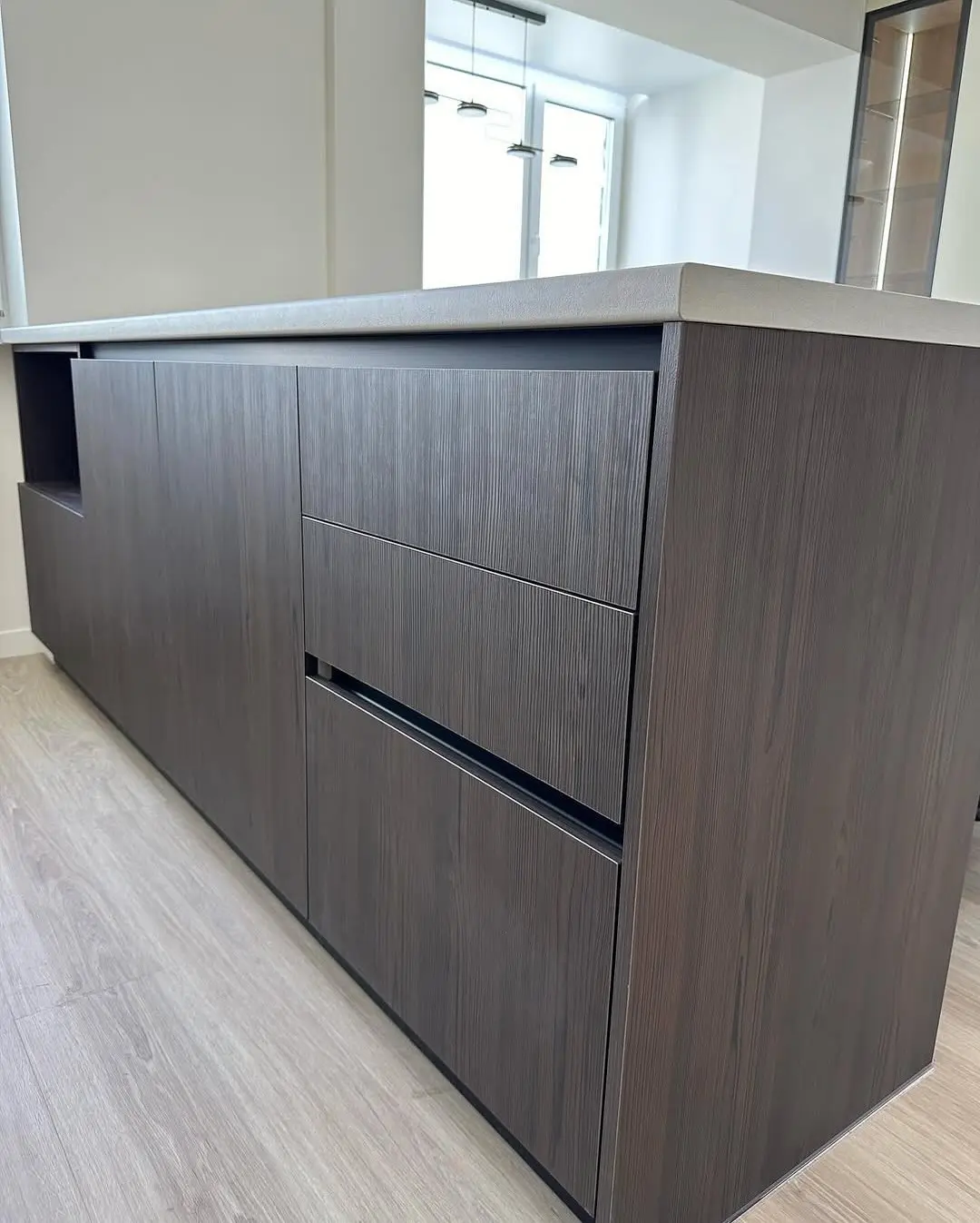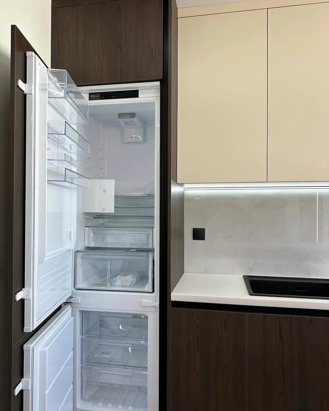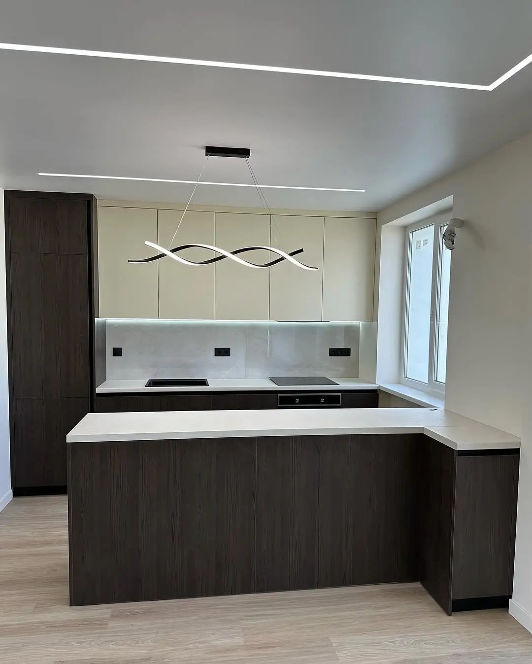 Кухня Шато — утончённое сочетание бежевого, розового и древесного оттенка венге. Тёплая цветовая палитра создаёт уютную атмосферу, а матовые фасады подчёркивают элегантность и современность дизайна. П-образная планировка делает кухню максимально удобной, а светлая столешница под камень добавляет визуальную лёгкость.