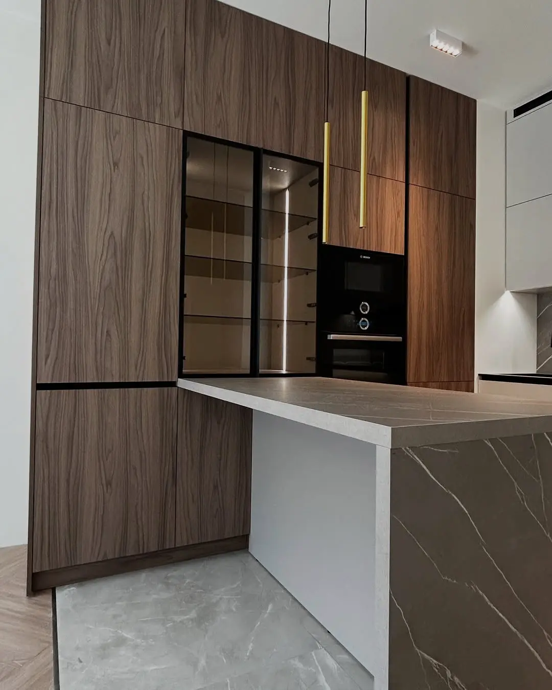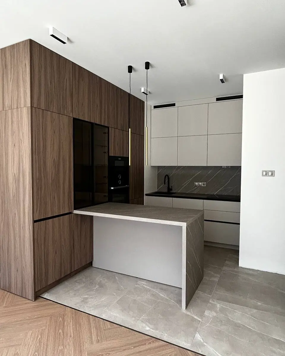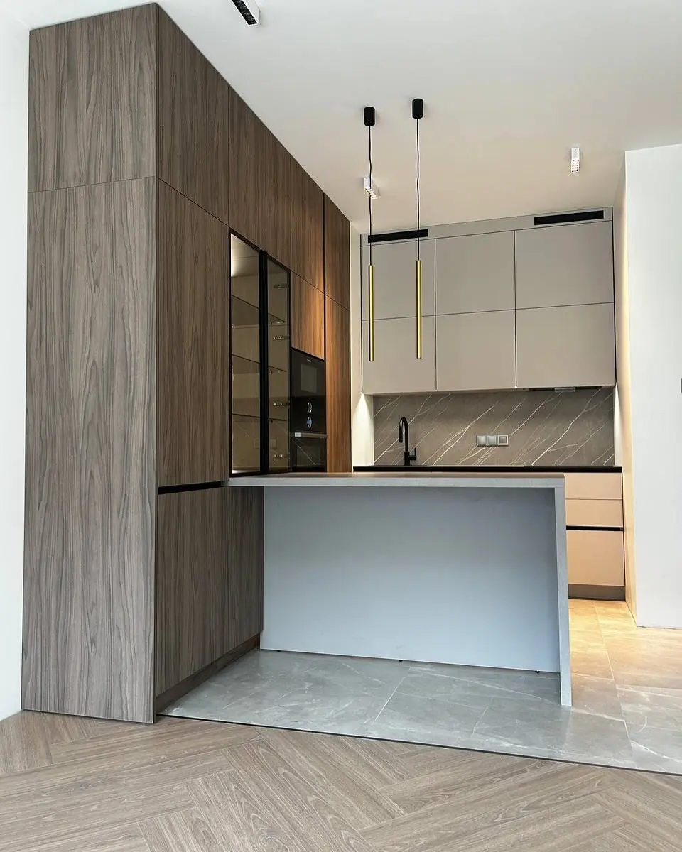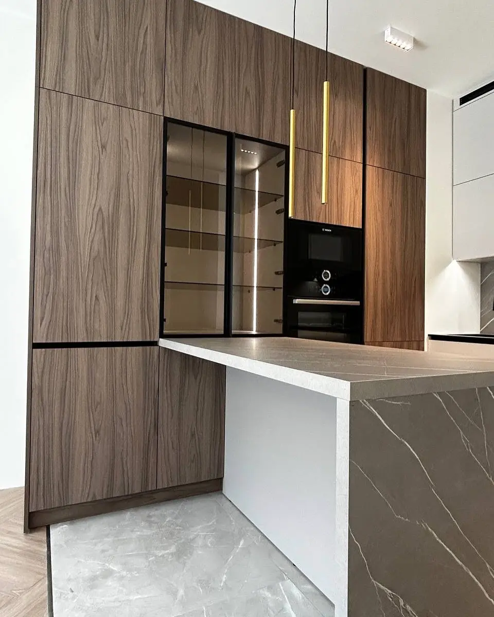 Кухня Шоколад — сочетание природной текстуры дерева и минималистичного дизайна. Коричневые фасады под дерево создают атмосферу уюта и тепла, а светлая столешница из кварца добавляет интерьеру современности. Угловая планировка с островом делает кухню функциональной и просторной, идеально вписываясь в современное городское пространство.