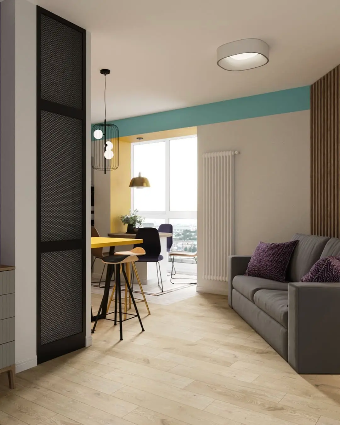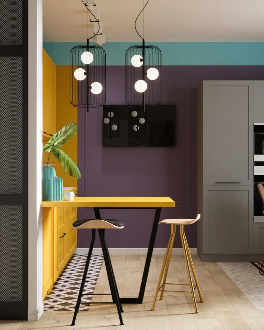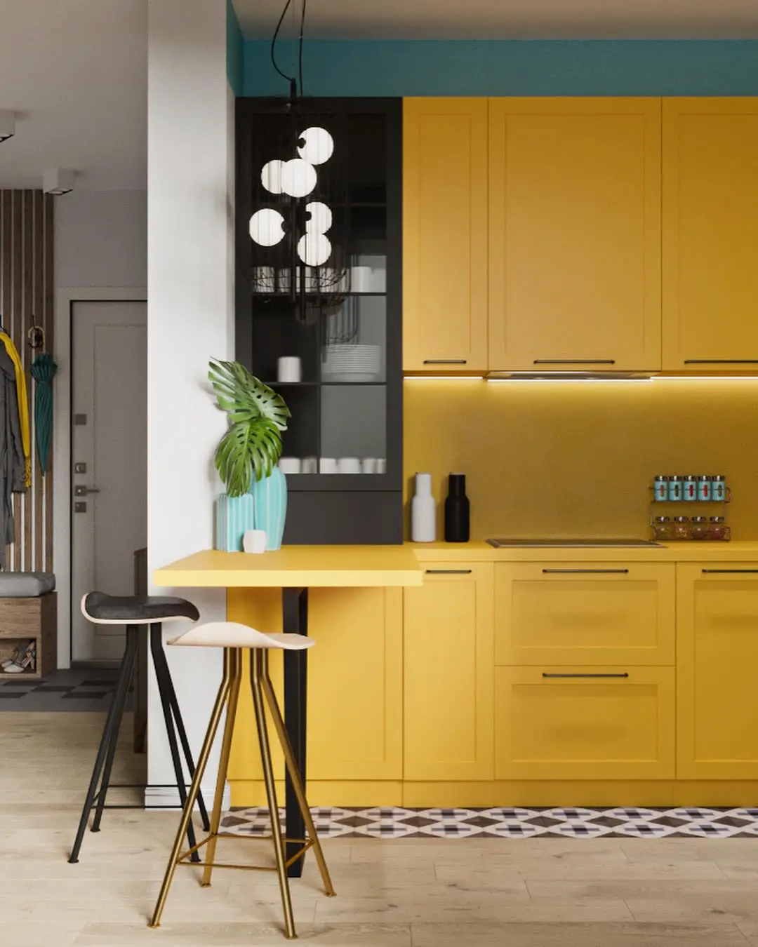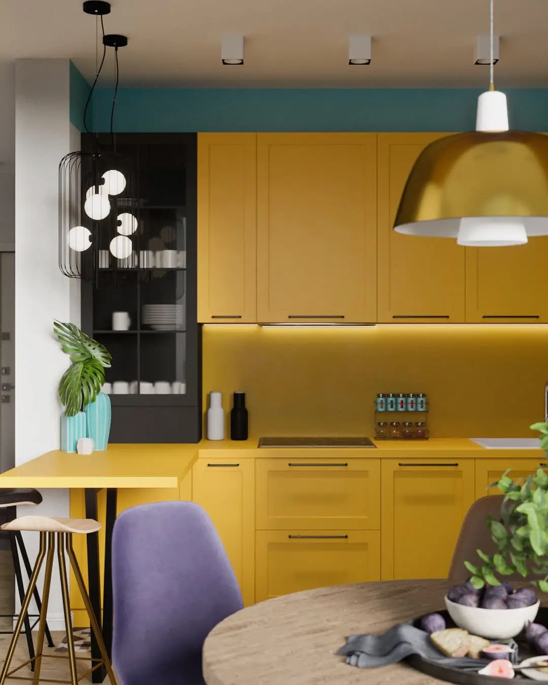 Угловая кухня в современном минималистичном стиле с яркими жёлтыми фасадами нижних шкафов из МДФ с эмалью, контрастирующими с чёрными верхними шкафами и витринами. Бирюзовый фартук добавляет свежести, а чёрная матовая столешница интегрирует плиту, раковину и встроенную технику. Барная стойка с фиолетовыми стульями и золотистым подвесным светильником создаёт уютный уголок, дополненный зелёными растениями в бирюзовых горшках, белой вытяжкой и LED-подсветкой. Идеально для динамичных пространств с акцентом на контрасты, функциональность и лёгкий уход, где жёлтый цвет наполняет энергией.