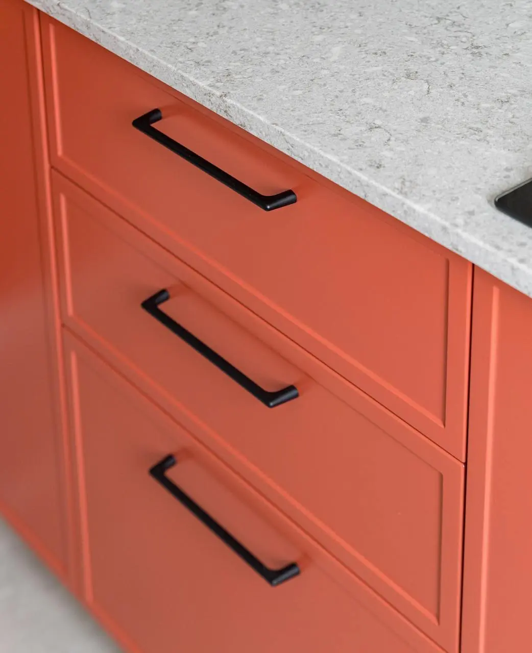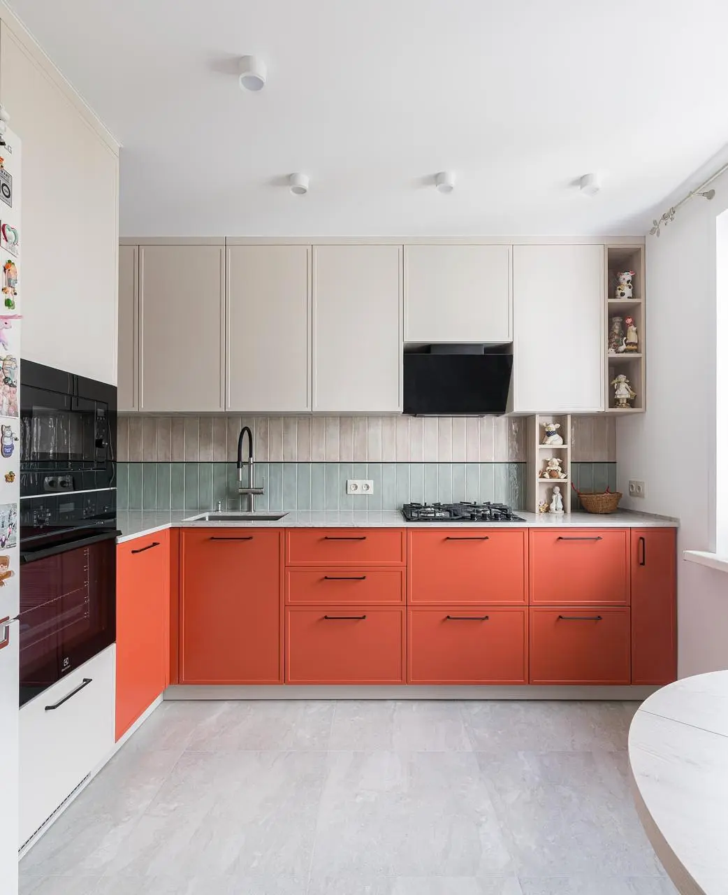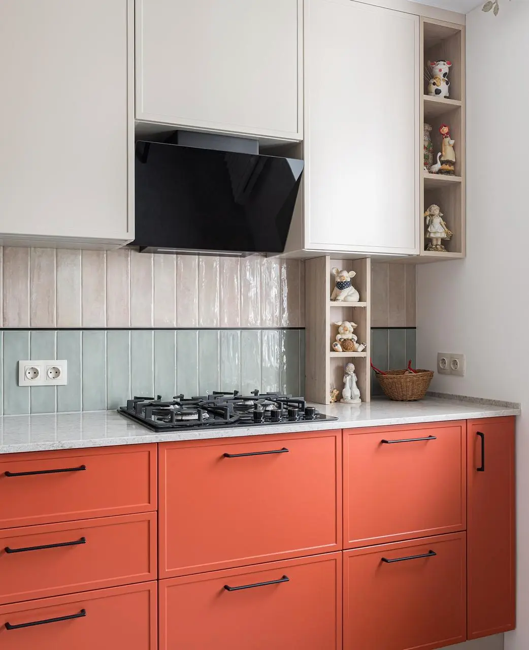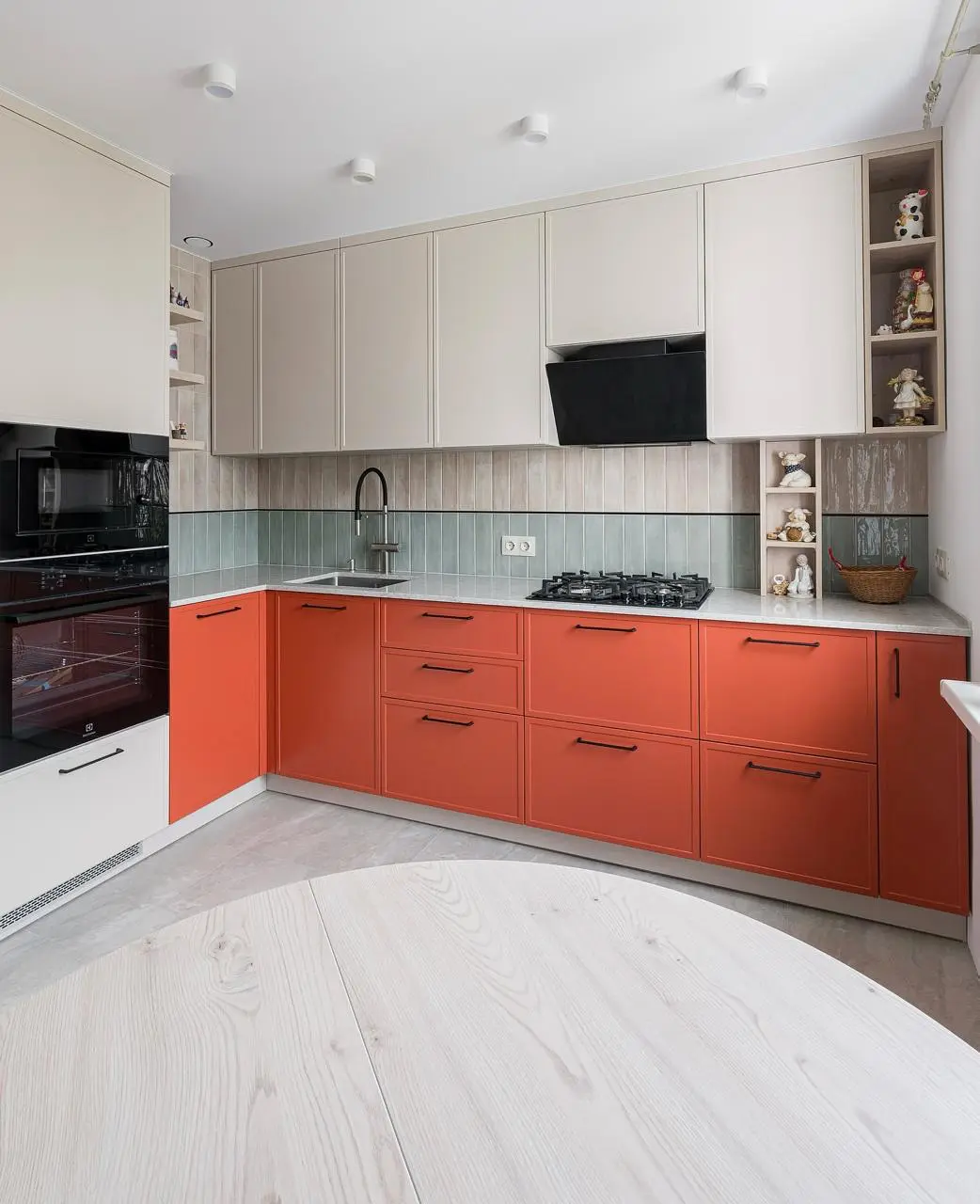 Кухня Терракота сочетает тёплые терракотовые нижние фасады с нейтральными светло-бежевыми верхними шкафами. Такое решение создаёт уютную атмосферу с современным характером. Светлая каменная столешница и плиточный фартук в серо-зелёных тонах добавляют лёгкости и текстуры. Контрастные чёрные ручки подчёркивают геометрию фасадов и делают дизайн выразительным.