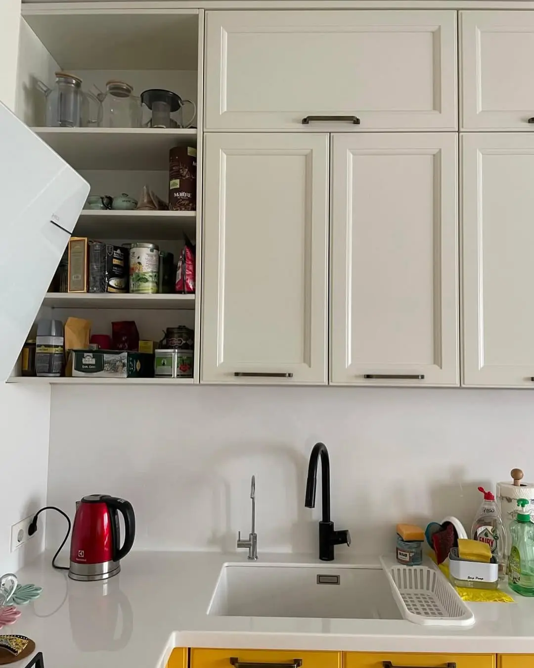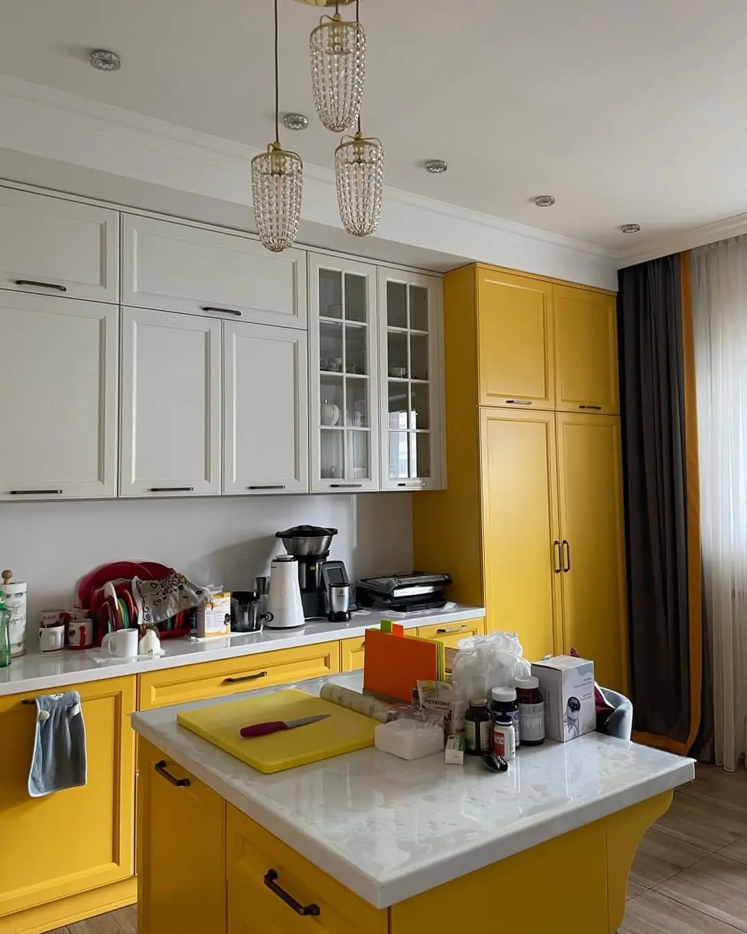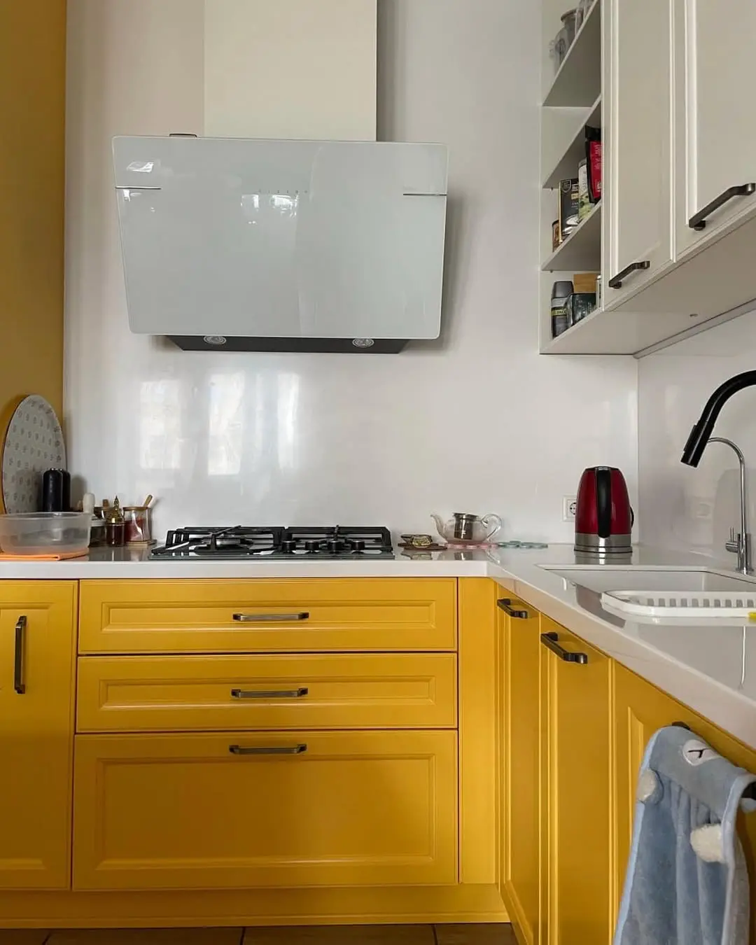 Угловая кухня в современном стиле с классическими элементами, где нижние шкафы в ярком жёлтом цвете из МДФ с эмалью контрастируют с белыми верхними шкафами с филенками и стеклянными дверцами. Белая столешница из кварца дополнена газовой плитой, белой вытяжкой и раковиной, создавая практичное пространство для готовки. Хрустальная люстра добавляет элегантности, а открытые полки с посудой и аксессуарами усиливают уют. Идеально для компактных помещений, сочетает яркий акцент с функциональностью и лёгкостью ухода.