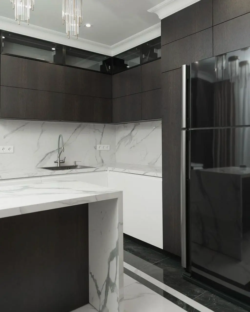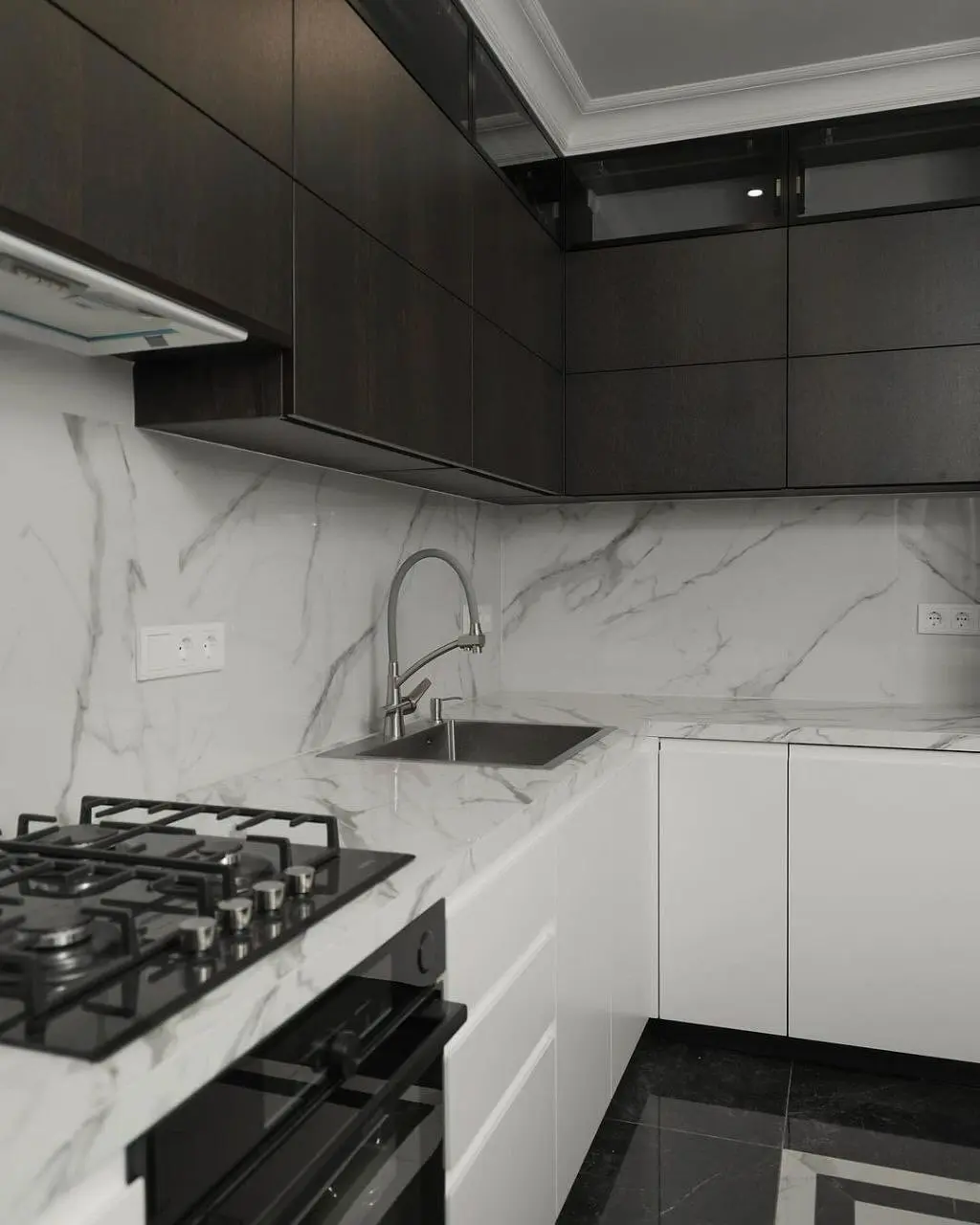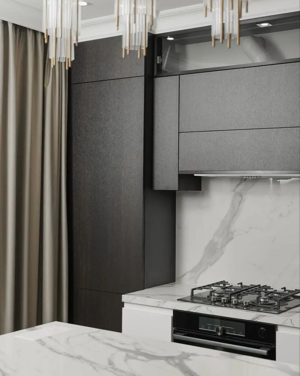 Кухня Виола — это сочетание глубины и света. Тёмные фасады под дерево создают выразительный акцент, а белый мрамор придаёт лёгкость и утончённость. Современный минимализм, продуманная геометрия и качественная фурнитура делают её не только стильной, но и удобной для повседневной жизни.