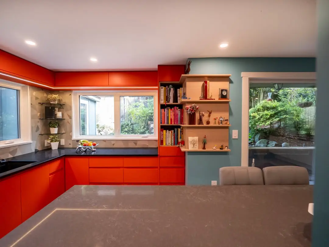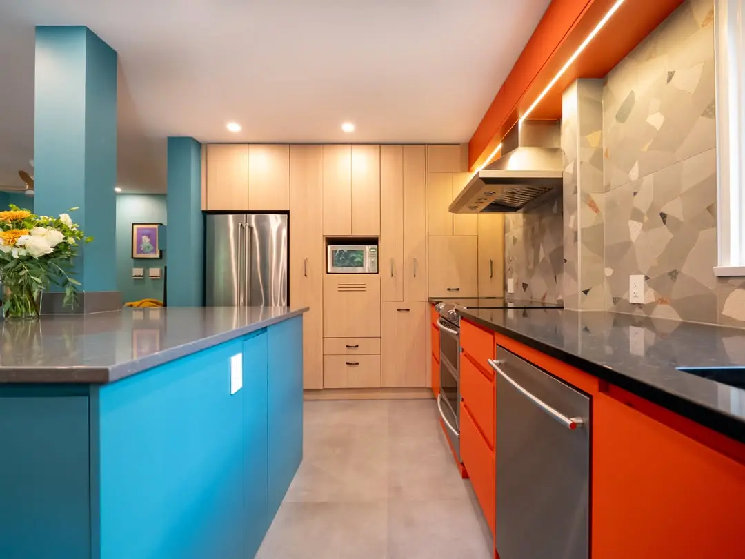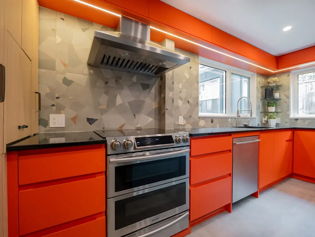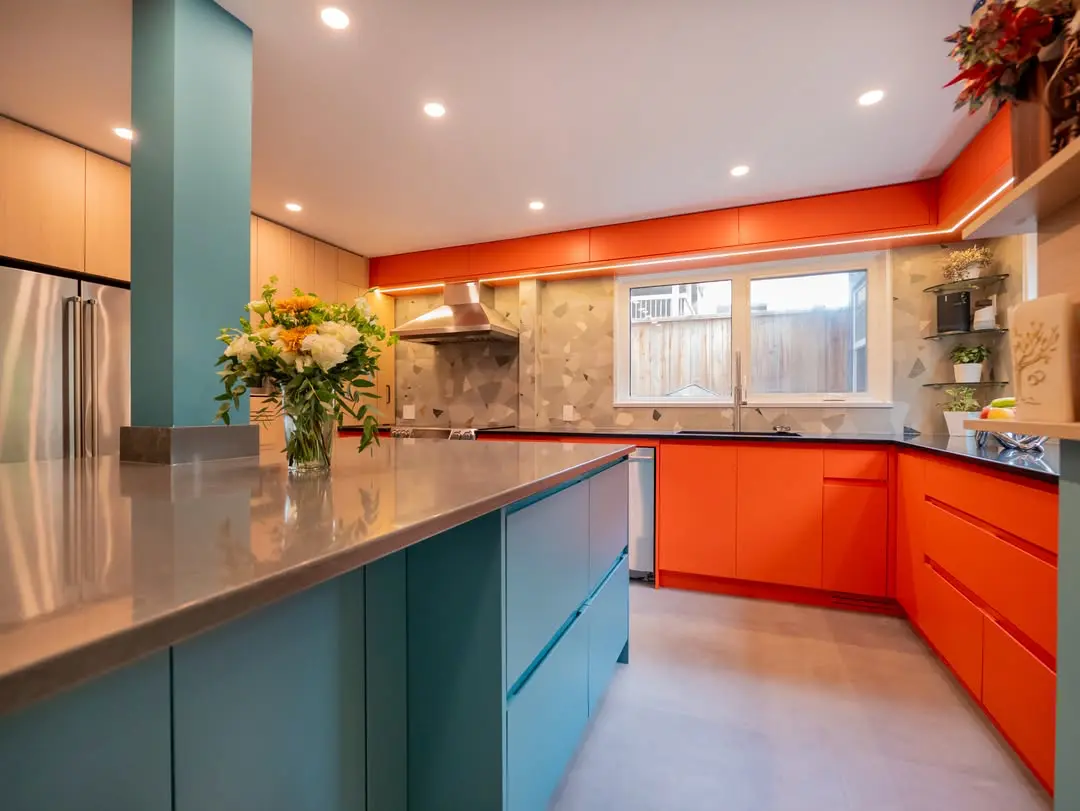 Угловая кухня в современном минималистичном стиле с яркими глянцевыми фасадами в оранжевом и голубом цветах из акрила, создающими динамичный контраст, и чёрной столешницей из кварца. Интегрированная техника включает мощную вытяжку, индукционную плиту, духовку и посудомоечную машину, дополненные геометрической плиткой на фартуке с терракотовыми и серыми чипсами для текстуры. Большие окна пропускают естественный свет, зелёные растения на полках добавляют свежести, а LED-подсветка под шкафами и вдоль фартука подчёркивает цвета. Идеально для открытых планировок, сочетает смелые акценты с функциональностью и современным дизайном.